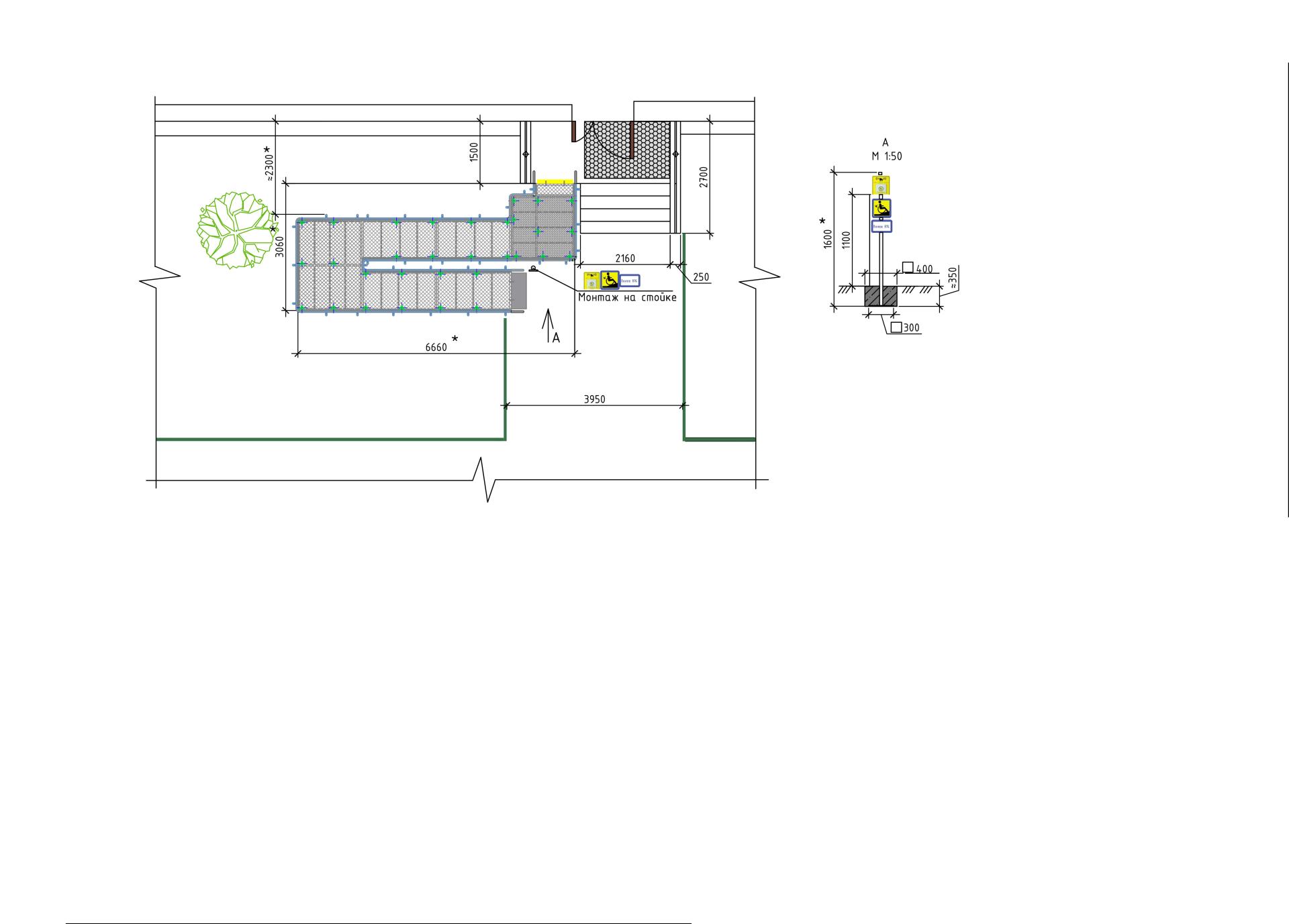 - Установить стойку перед заездом на пандус-конструктор, на которой будет установлена кнопка вызова персонала для ситуационной помощи, знак "Осторожно! Крутой подъем" и табличка "не более 8%" (согласно пункту 4.3.9.3 ГОСТ Р 52131-2019).