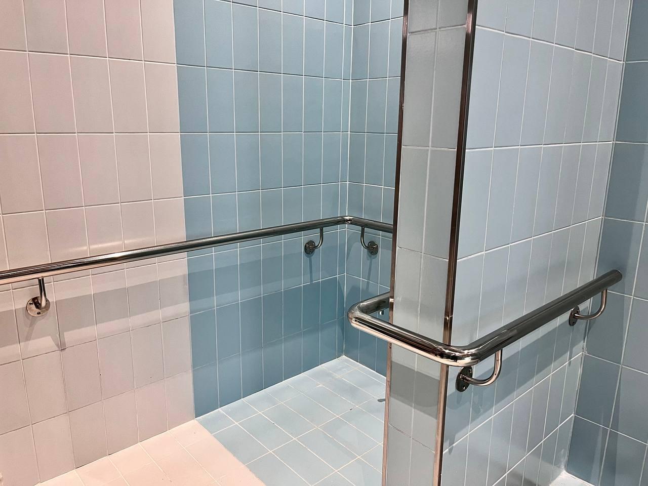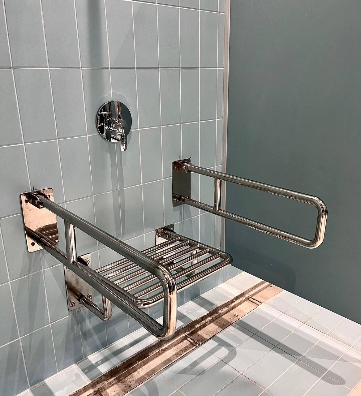 - Душевые для инвалидов с нарушением опорно-двигательного аппарата имеют открытую кабину с нескользким полом. Кабина оборудована переносным или складным сиденьем, расположенным на высоте не более 0,48 метра от уровня поддона, ручным душем и настенными поручнями. Размеры сиденья составляют не менее 0,5 метра по глубине и длине.