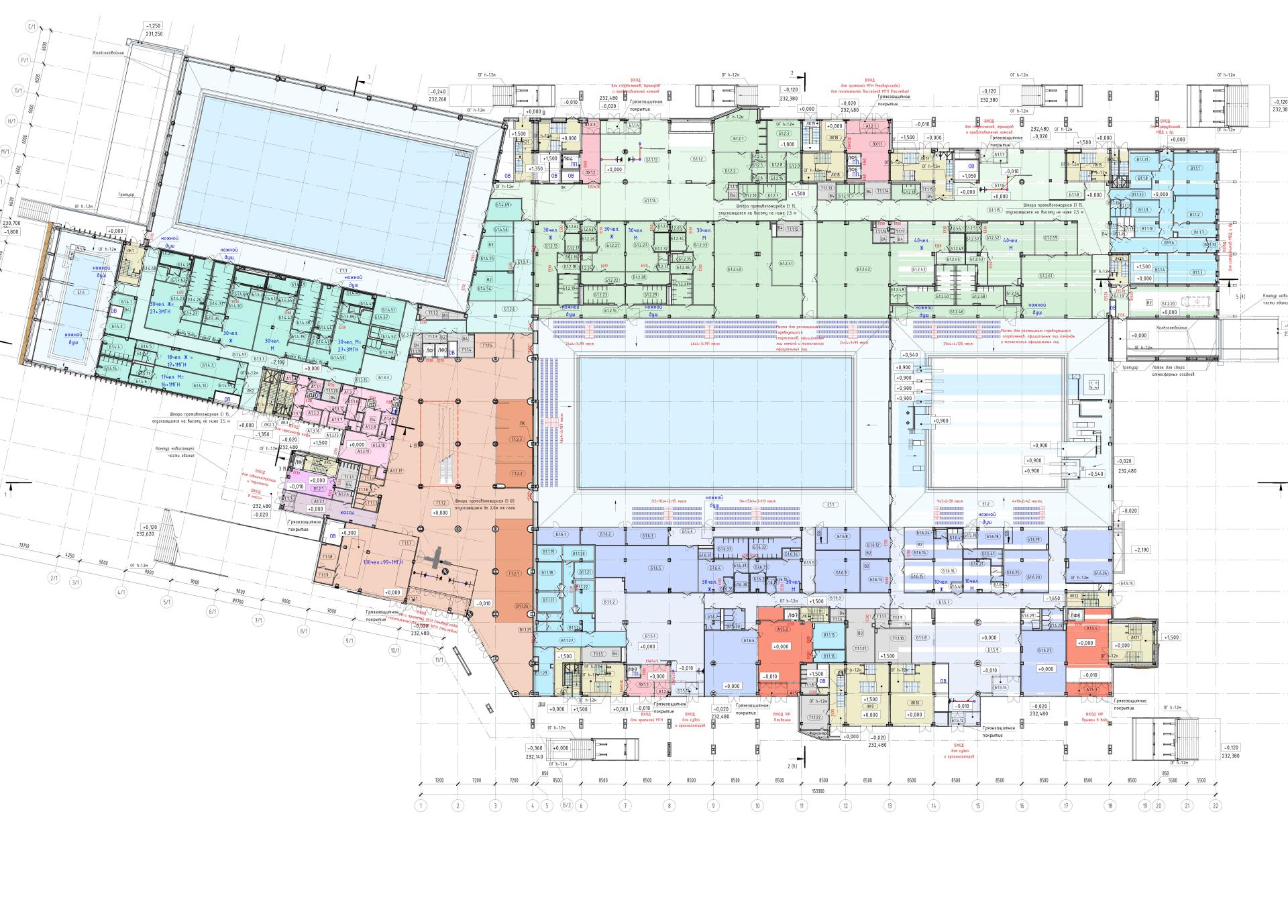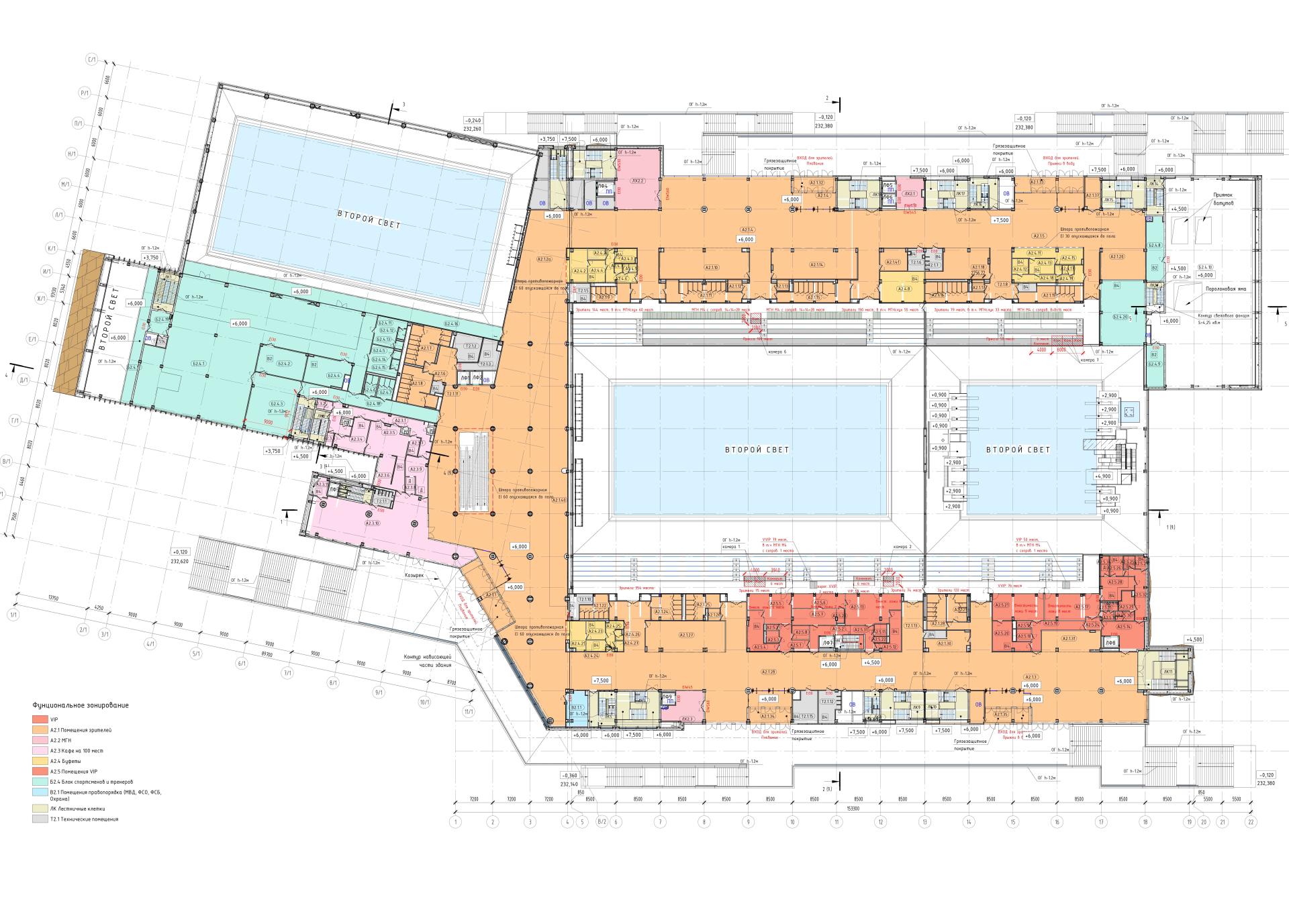 - ЛФ1, ЛФ2: группа лифтов, предназначенных для перемещения прессы, зрителей и маломобильных групп населения (МГН).