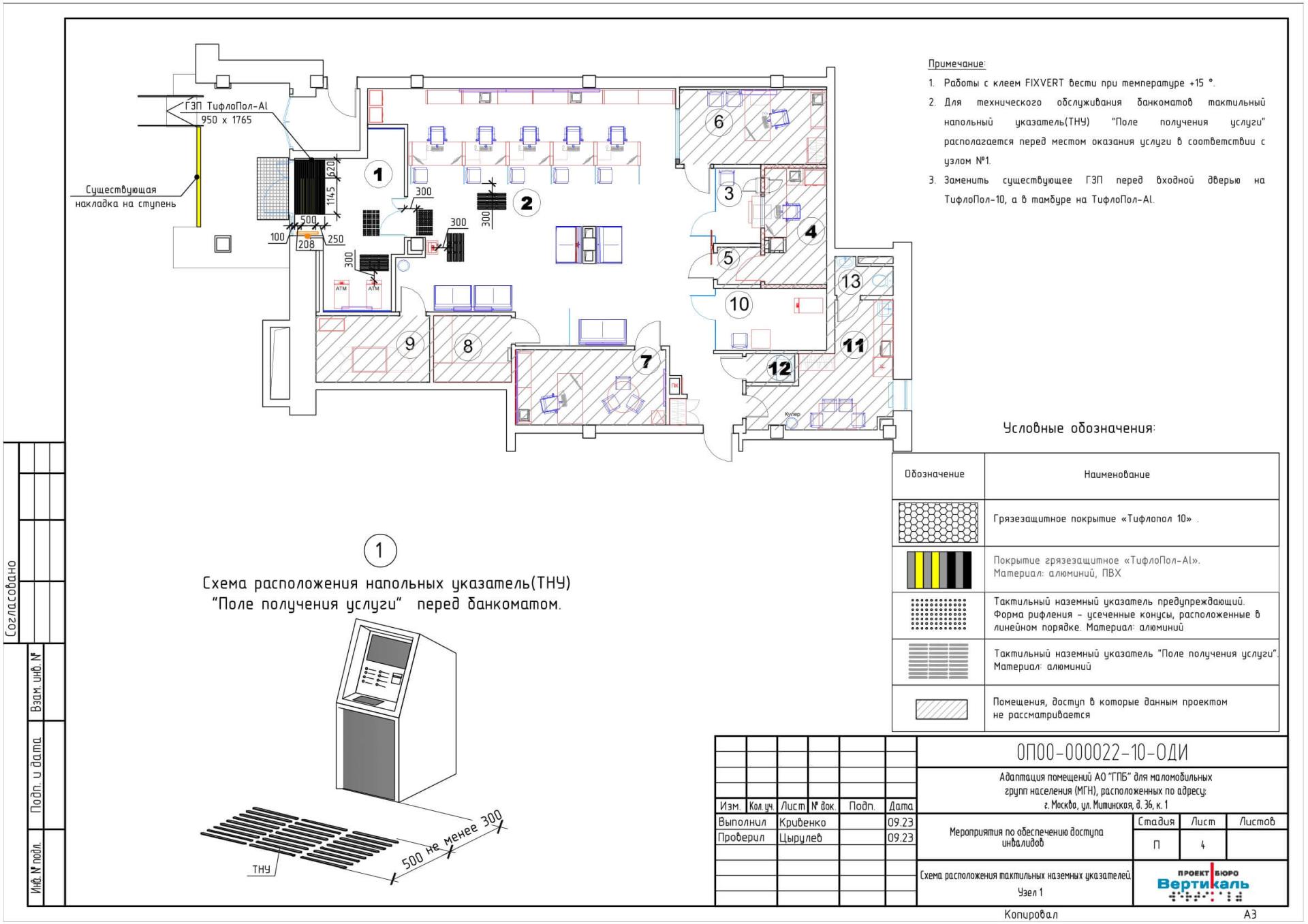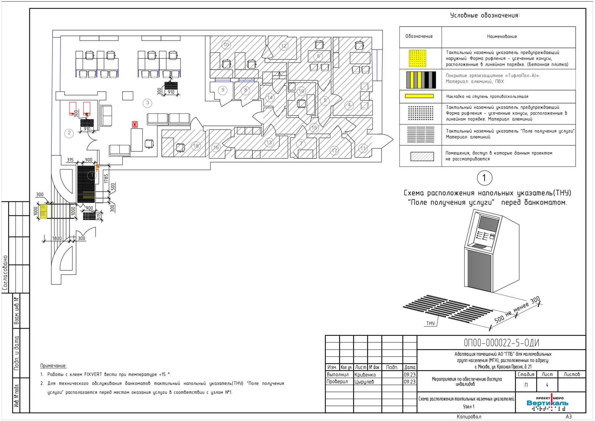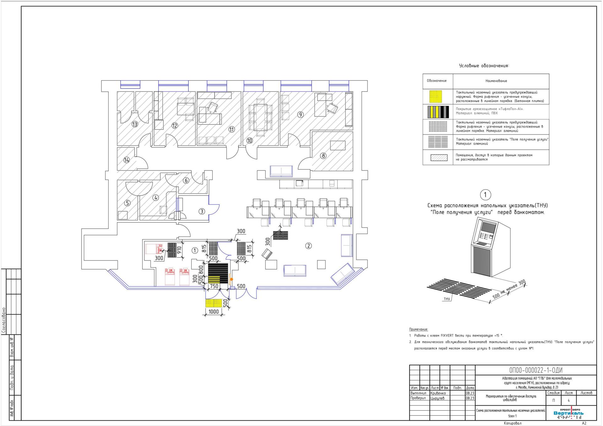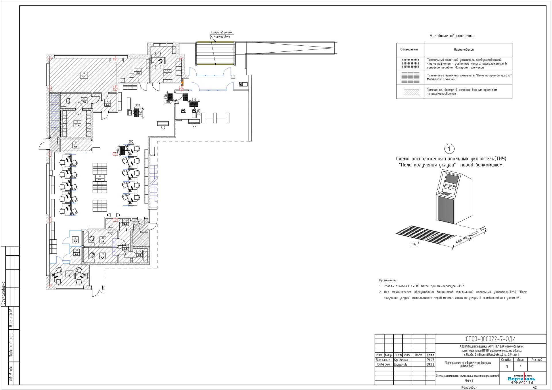 При проектировании МОДИ в каждом из представленных офисов банка прошло обследование помещения, по итогам которого составились графические эскизы: обмерный план помещений, план помещений до адаптации с указанием пути перемещения и пути эвакуации МГН, схема распложения тактильных визуальных указателей, схема расположения тактильных наземных указателей.