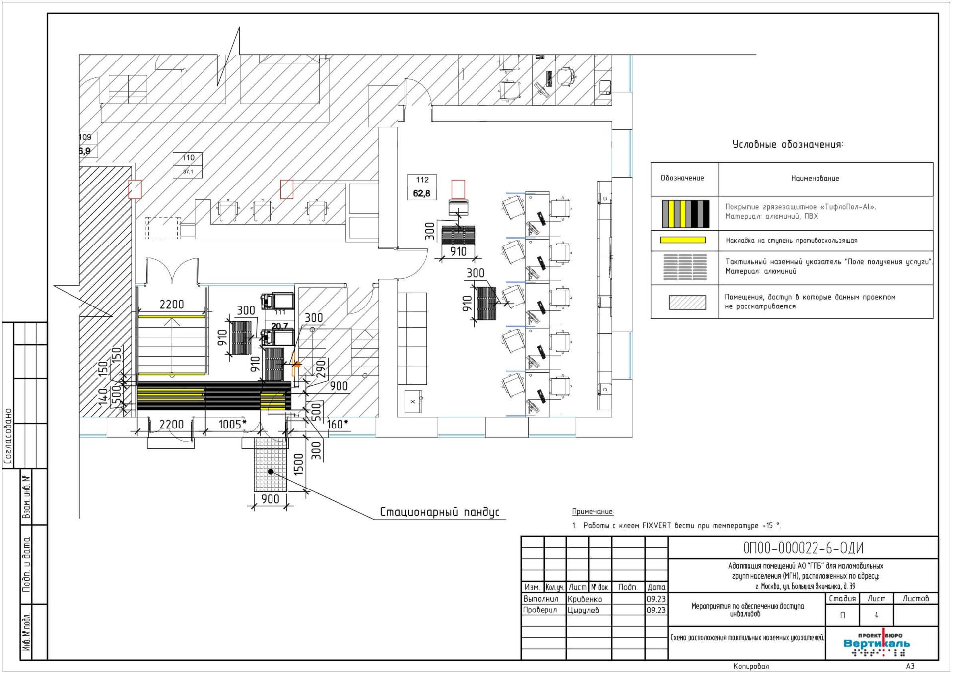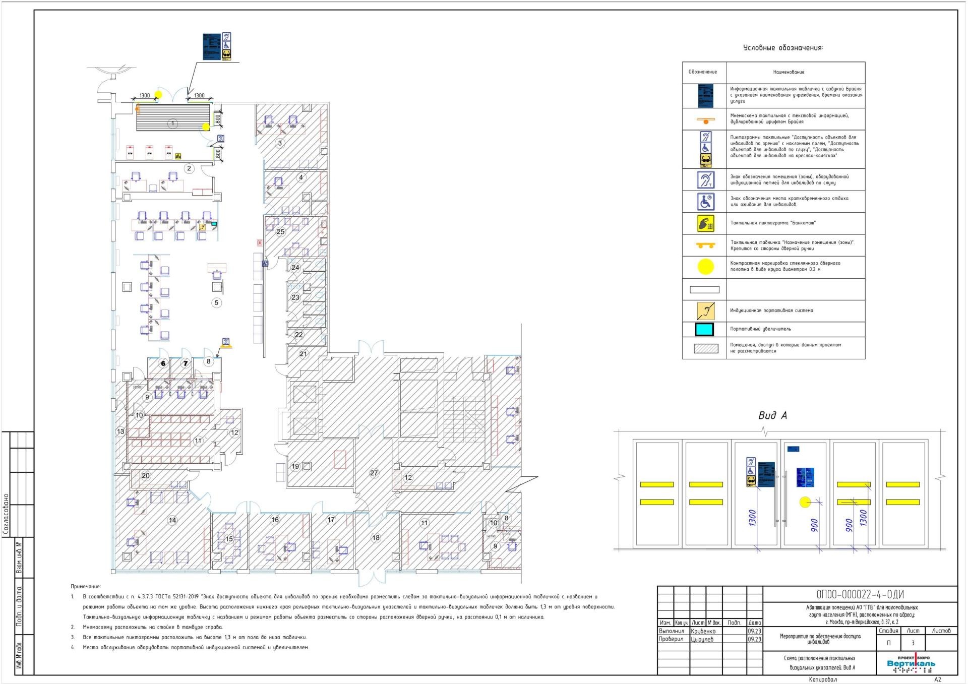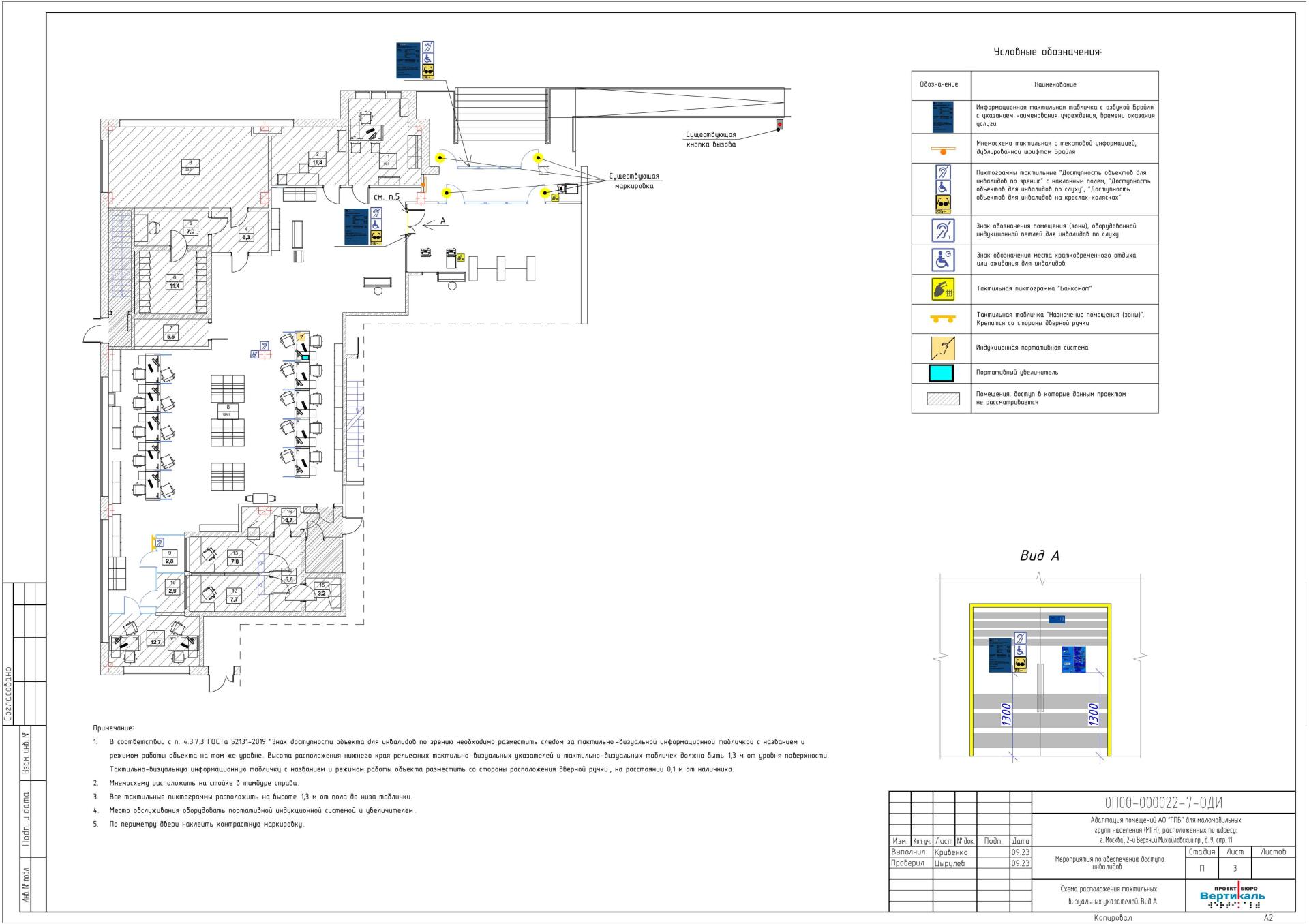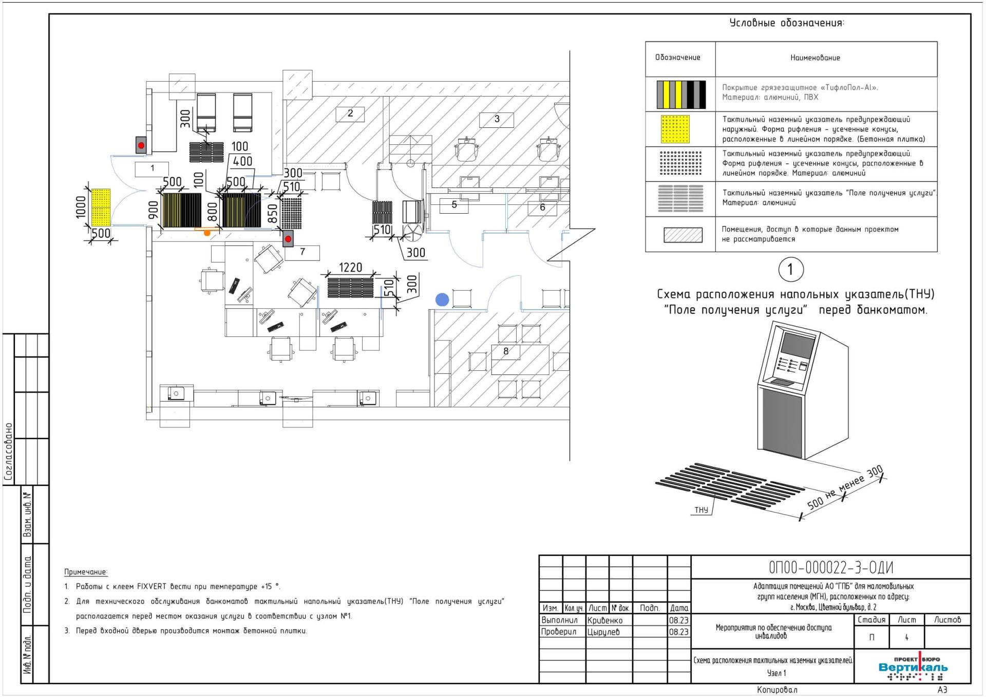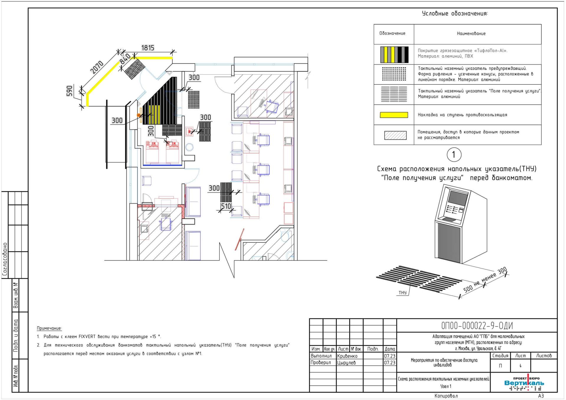 При проектировании МОДИ в каждом из представленных офисов банка прошло обследование помещения, по итогам которого составились графические эскизы: обмерный план помещений, план помещений до адаптации с указанием пути перемещения и пути эвакуации МГН, схема распложения тактильных визуальных указателей, схема расположения тактильных наземных указателей.