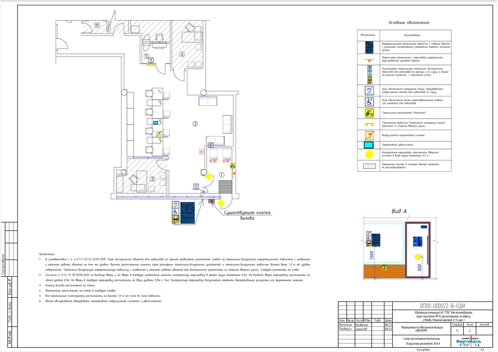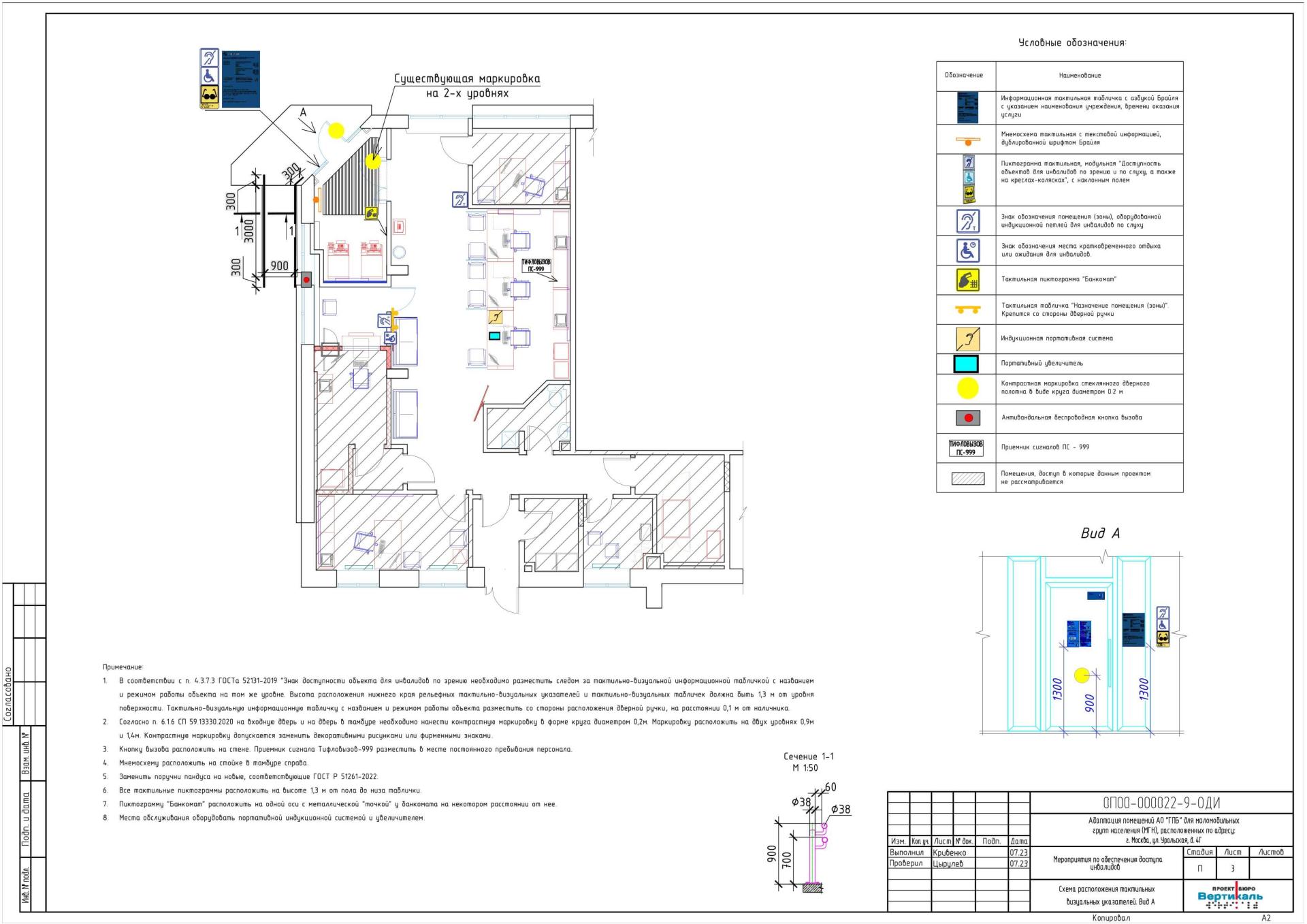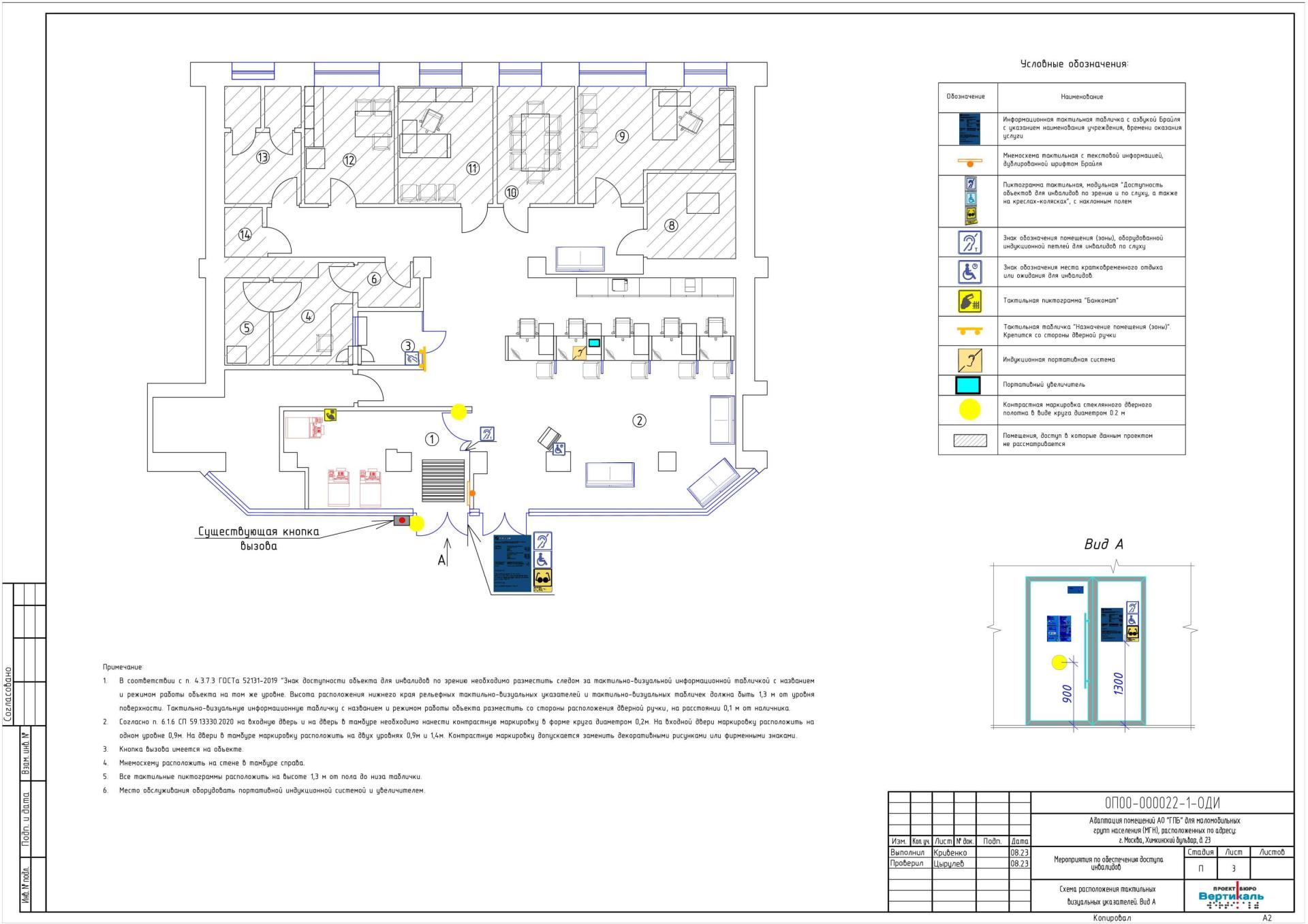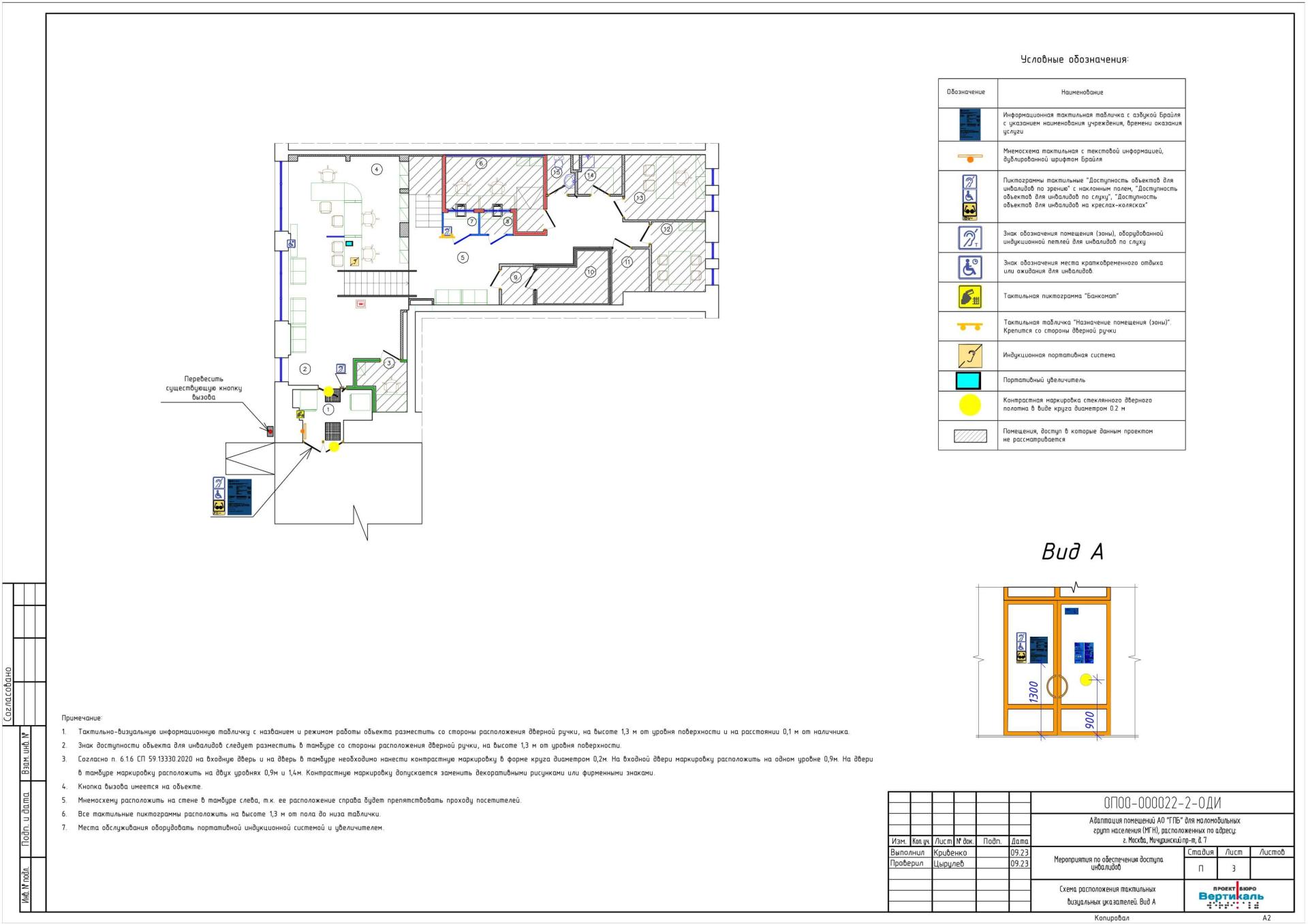При проектировании МОДИ в каждом из представленных офисов банка прошло обследование помещения, по итогам которого составились графические эскизы: обмерный план помещений, план помещений до адаптации с указанием пути перемещения и пути эвакуации МГН, схема распложения тактильных визуальных указателей, схема расположения тактильных наземных указателей.