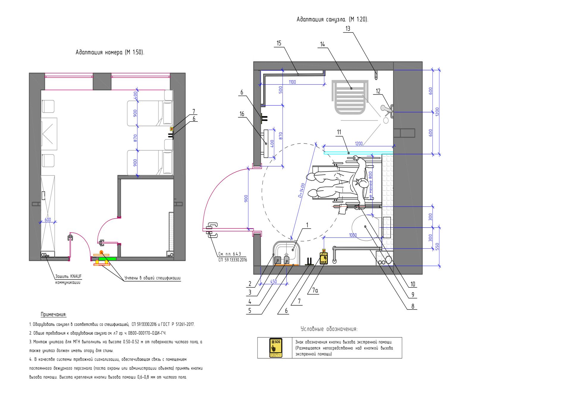 Адаптация номера для МГН. Для выполнения работ по адаптации номера и санузла будет придерживаться требований, указанных в листах 7, 8 и 9 гр. 0В00-000170-ОДИ-ГЧ.