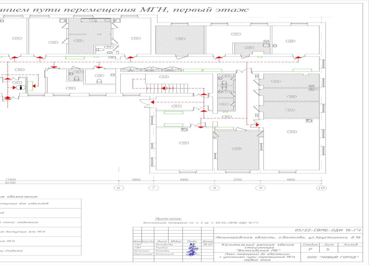 Проект предусматривает комплексный комплекс мер по обеспечению безбарьерного передвижения людей с ограниченными возможностями и маломобильных групп населения в пределах помещений Волосовской МБДОУ в Волосово. Эти меры соответствуют соответствующим строительным нормам и правилам и не ограничивают условия или ущемляют возможности других групп населения, находящихся в помещениях больницы. После реализации мер будет обеспечена возможность безбарьерного передвижения инвалидов групп мобильности М1-М4 от входа в здание до внутренних помещений больницы.