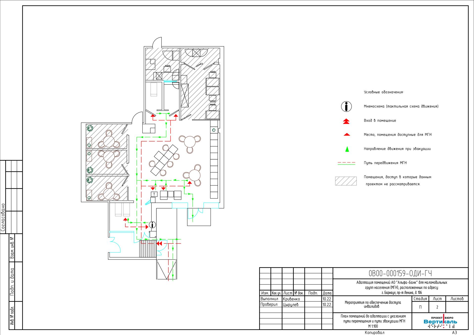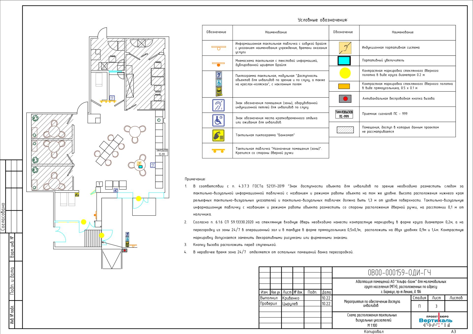 В заключение отметим, что данный проект направлен на обеспечение доступности помещений банка для людей с ограниченными возможностями и маломобильных групп населения. Адаптационные меры, предлагаемые в этом проекте, основаны на действующих строительных нормах и предписаниях и предназначены для улучшения качества архитектурной среды без ограничения условий жизни или возможностей других групп населения. Реализация этих мер обеспечит возможность безбарьерного передвижения людей с ограниченными возможностями и маломобильных групп от входа в здание до внутренних помещений и расширит их доступ к информации, услугам и оборудованию самообслуживания.