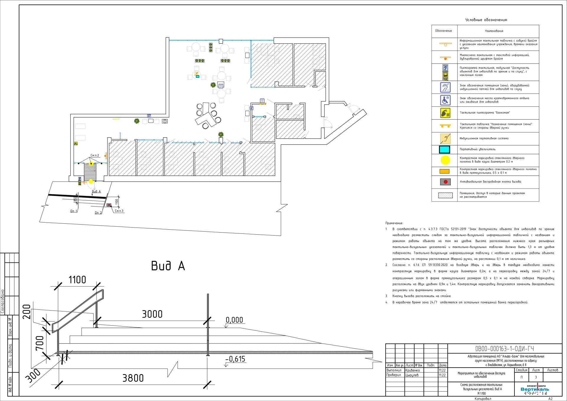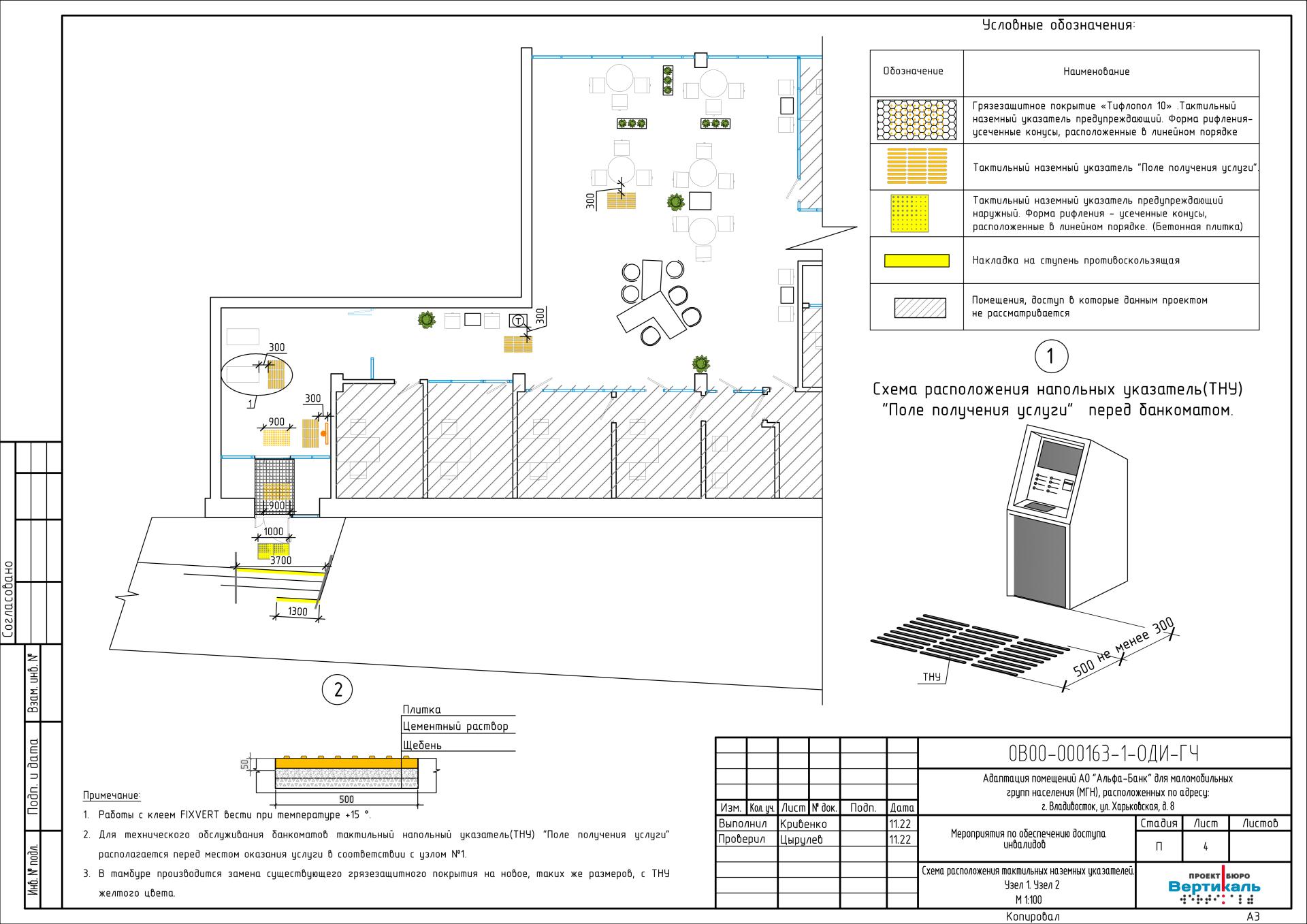 Проект также включает меры по улучшению доступности для людей с нарушениями зрения. К ним относятся тактильные настенные указатели на путях перемещения маломобильных групп, такие как тактильная визуальная табличка с указанием названия учреждения и режима работы шрифтом Брайля (100x300 мм), тактильная мнемоника с планом и назначением помещений (470 x 610 мм) и другие знаки, указывающие доступность, банкоматы и зоны кратковременного отдыха.