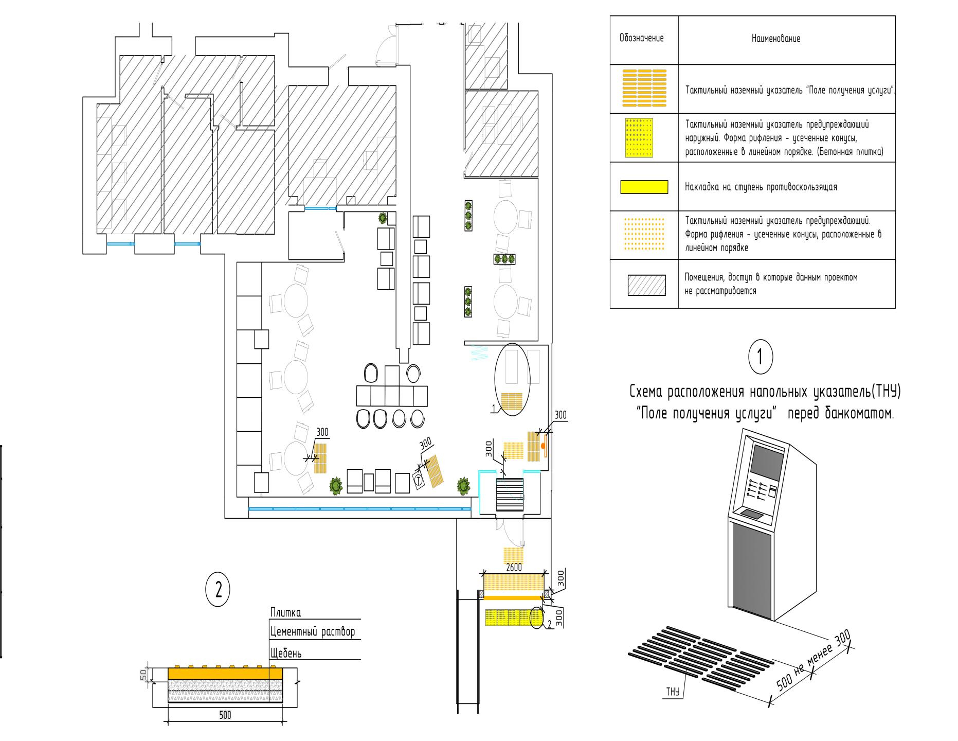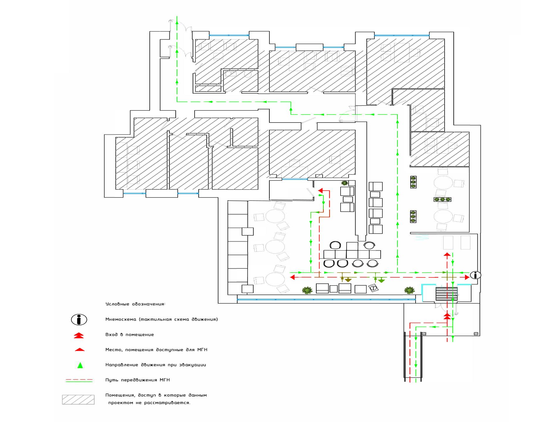 Проектные решения не ограничивают условия пребывания и возможности других групп населения, находящихся в помещении банка. После реализации предусмотренных проектом мероприятий будет обеспечена возможность беспрепятственного перемещения лиц с ограниченной подвижностью (группы мобильности М1-М4) от входа здания до внутренних помещений. Для этого на путях перемещения МГН будут установлены тактильные настенные указатели.