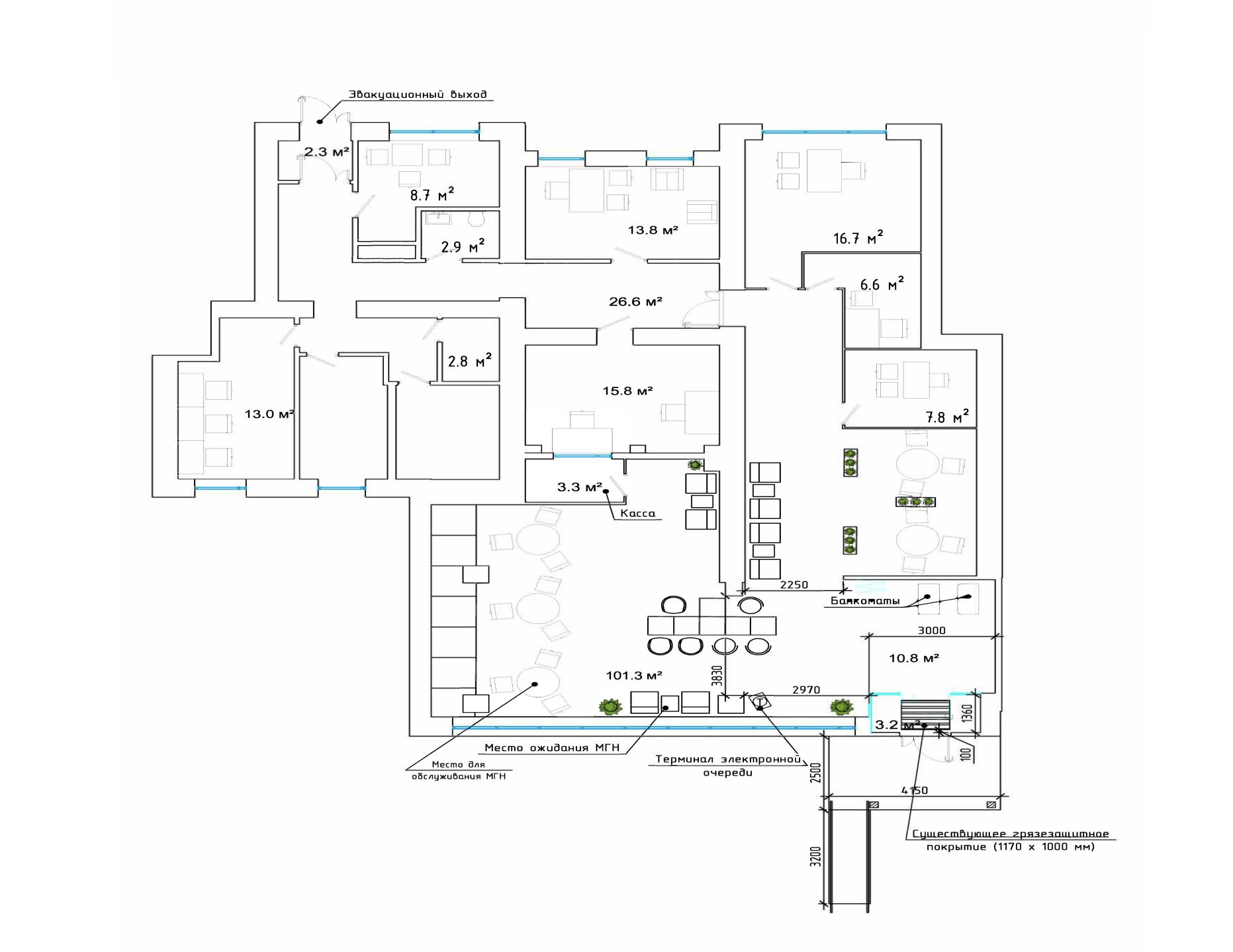 В рамках проекта предусмотрены комплексные мероприятия, направленные на улучшение архитектурной среды с соблюдением следующих принципов: Обеспечение доступности мест назначения для посещения по кратчайшему пути и возможность беспрепятственного перемещения внутри помещений банка. Обеспечение безопасности маршрутов движения и областей обслуживания.