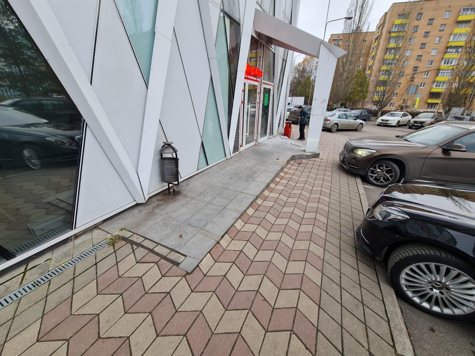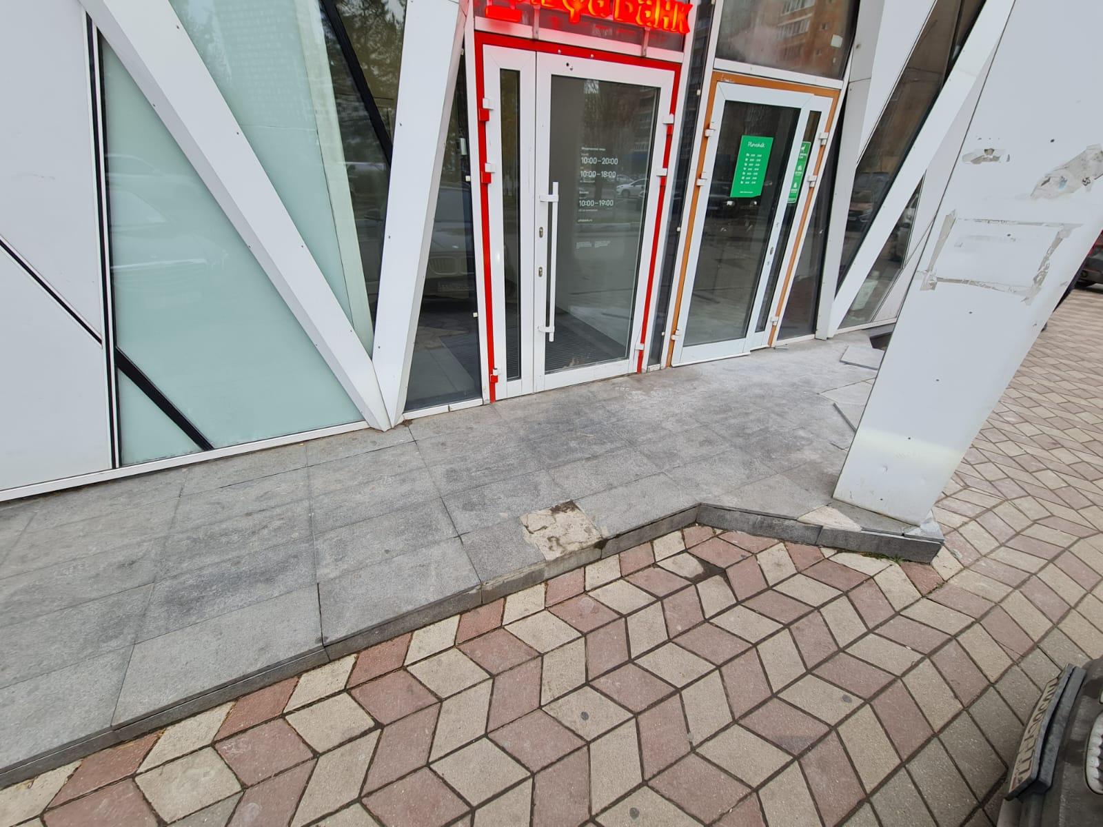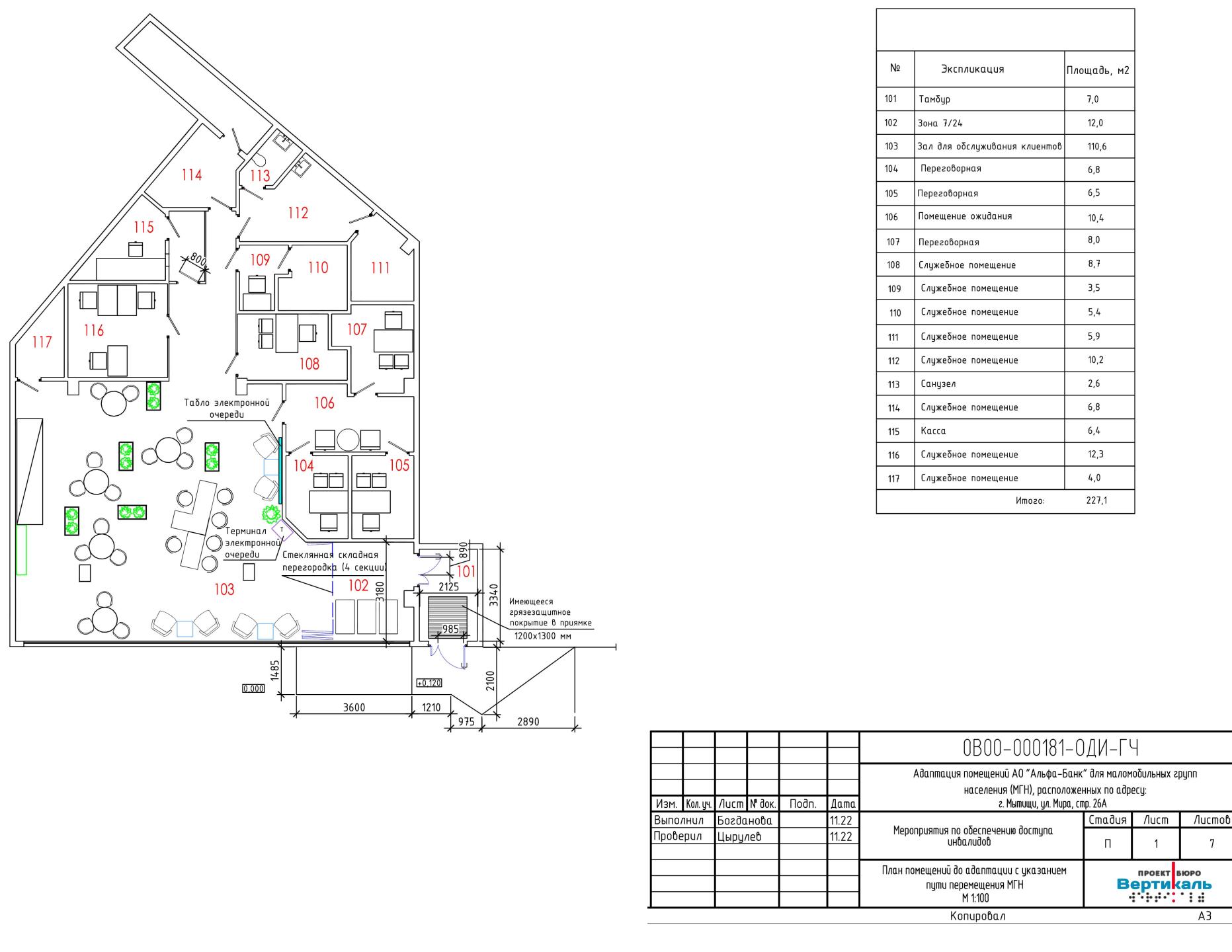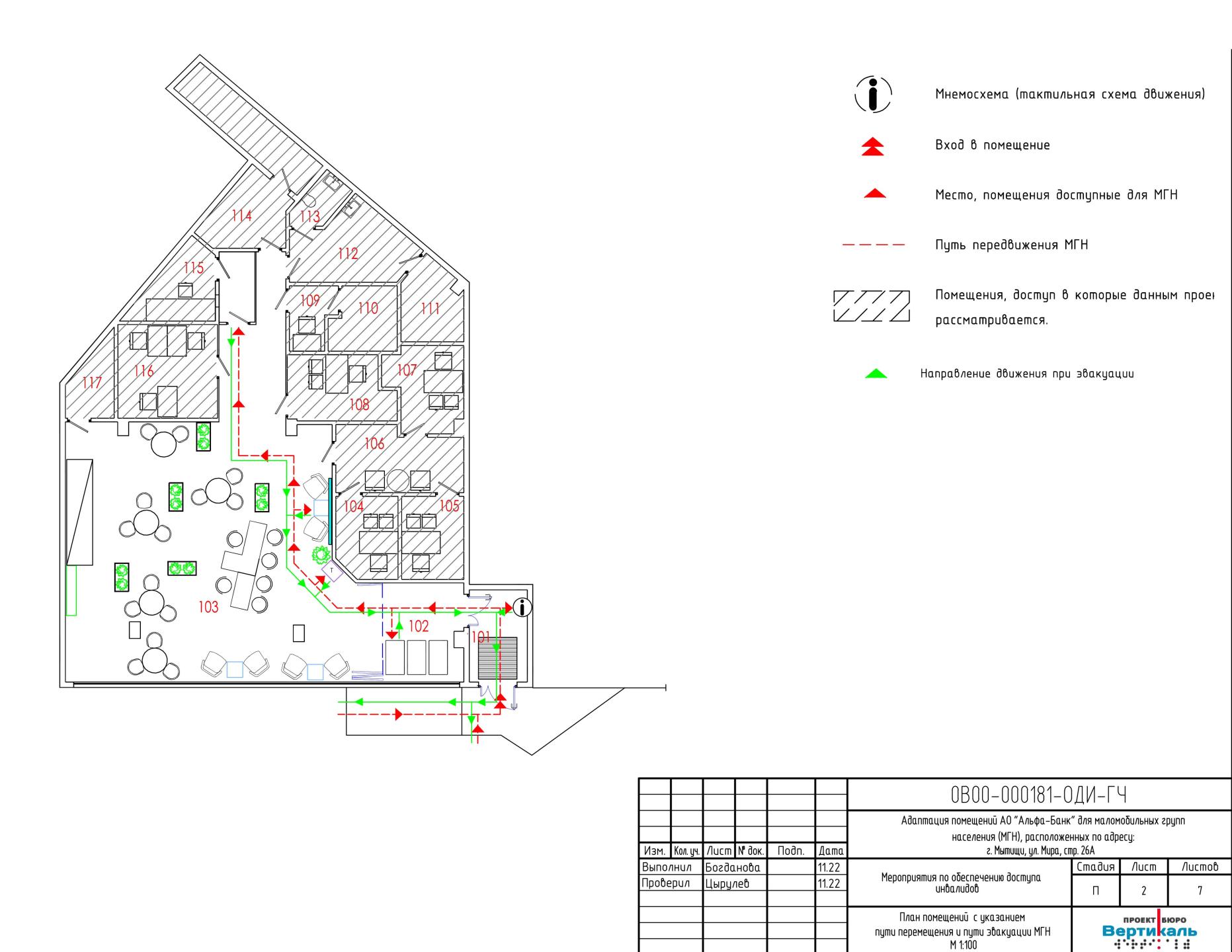 Кроме того, в соответствии с пунктом 6.1.6 СП 59.13330.2020, входные двери, доступные для инвалидов и МГН, должны быть хорошо опознаваемы и иметь знак, указывающий на доступность здания. В проекте предусмотрена контрастная маркировка на прозрачных рабочих створках входной двери и двери из тамбура в зону 7/24 в форме круга диаметром 0,2 м, расположенная на двух уровнях - 0,9 м и 1,4 м. Также предусмотрена контрастная маркировка на прозрачных секциях складной перегородки, отделяющей зону 7/24 от зала обслуживания клиентов, в форме прямоугольника высотой не менее 0,1 м и шириной не менее 0,2 м. Расположение контрастной маркировки предусматривается на двух уровнях: 0,90-1,0 м и 1,3-1,4 м. Ручка входной двери из металла с белым покрытием заменяется рекомендуемой ручкой красного цвета, что соответствует требованиям СП 59.13330.29020. То же самое относится к ручке двери из тамбура в зону 7/24.