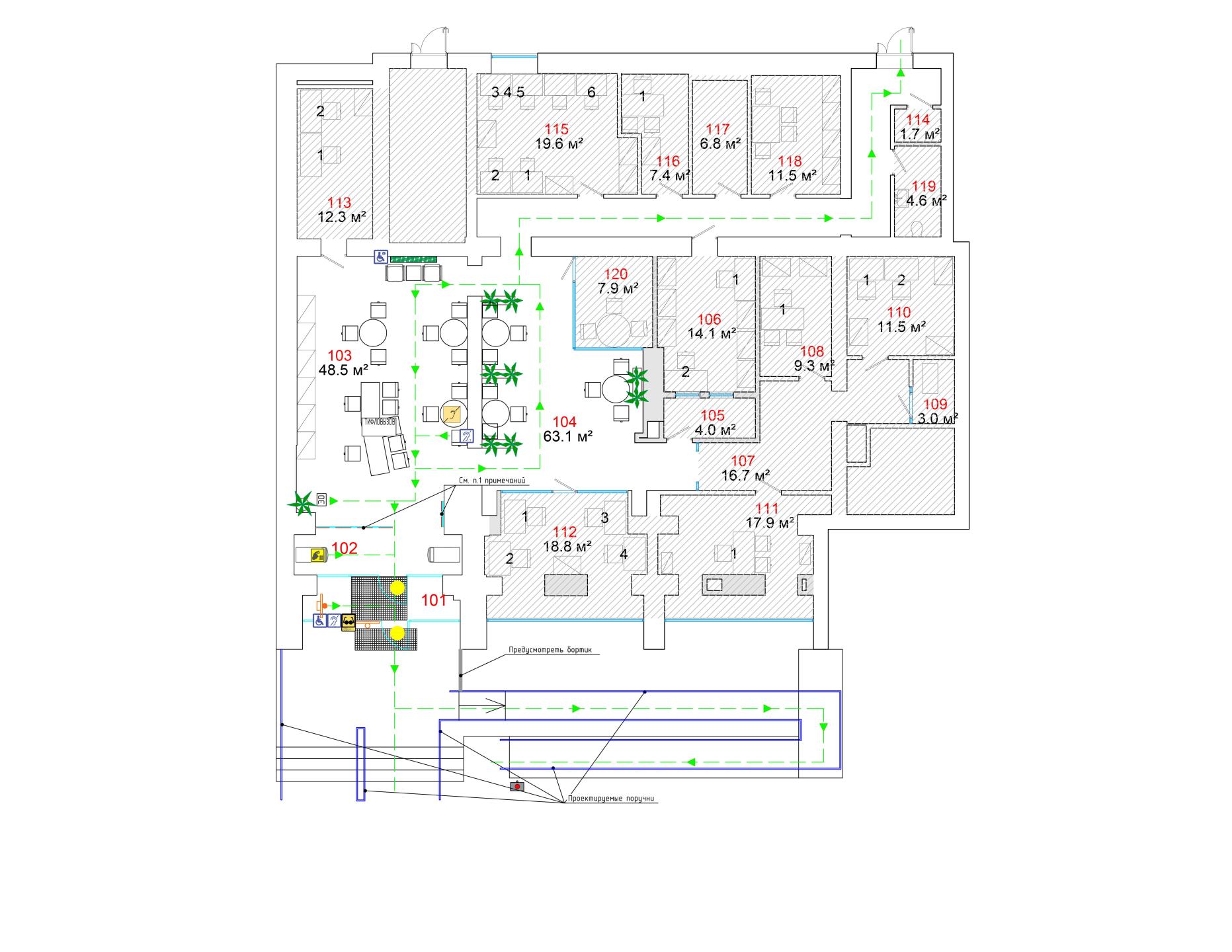 Реализация проекта позволит обеспечить безбарьерное следование инвалидов групп мобильности М1-М4 от входа здания к внутренним помещениям банка. Тактильные указатели и наземные индикаторы обеспечат ясную информацию и ориентацию для МГН, способствуя повышению доступности и комфорта при посещении банка.