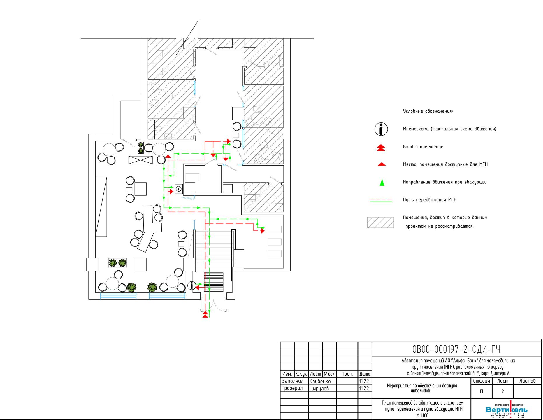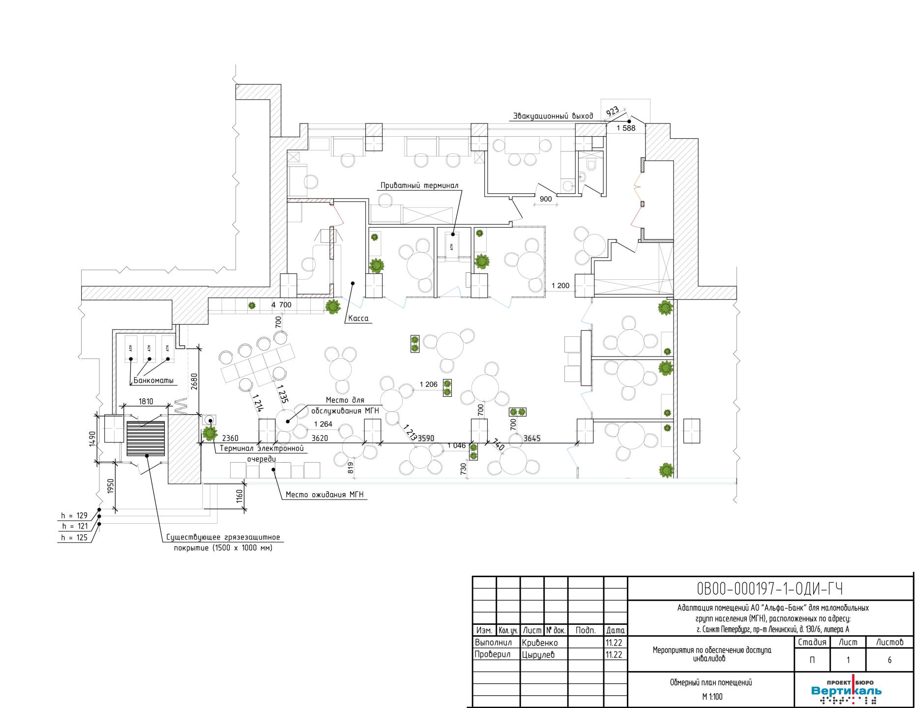 Город Санкт-Петербург, проспект Ленинский, дом 130/6, литера А, проспект Коломяжский, дом 15, корпус 2, литера А, проспект Тореза, дом 9, литера А, проспект Стачек, дом 47, литера Е. Настоящий проект разработан для обеспечения безбарьерного доступа для людей с ограниченными возможностями и маломобильных групп населения (МГН) в помещения банка по принципу "разумного приспособления". Проект предусматривает адаптацию эксплуатируемого помещения банка, расположенного по адресу: город Санкт-Петербург, проспект Ленинский, дом 130/6, литера А.