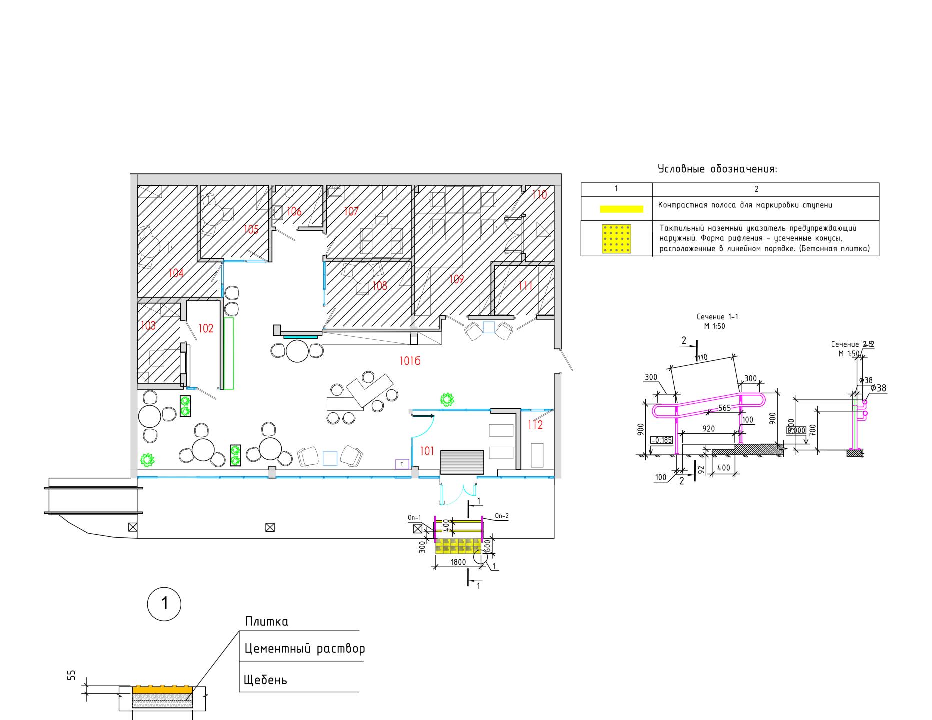 После реализации мероприятий, предусмотренных проектом, инвалиды с разными уровнями подвижности (М1-М4) смогут свободно перемещаться от входа здания до внутренних помещений. Для обеспечения навигации МГН предусмотрены тактильные настенные указатели на путях перемещения.