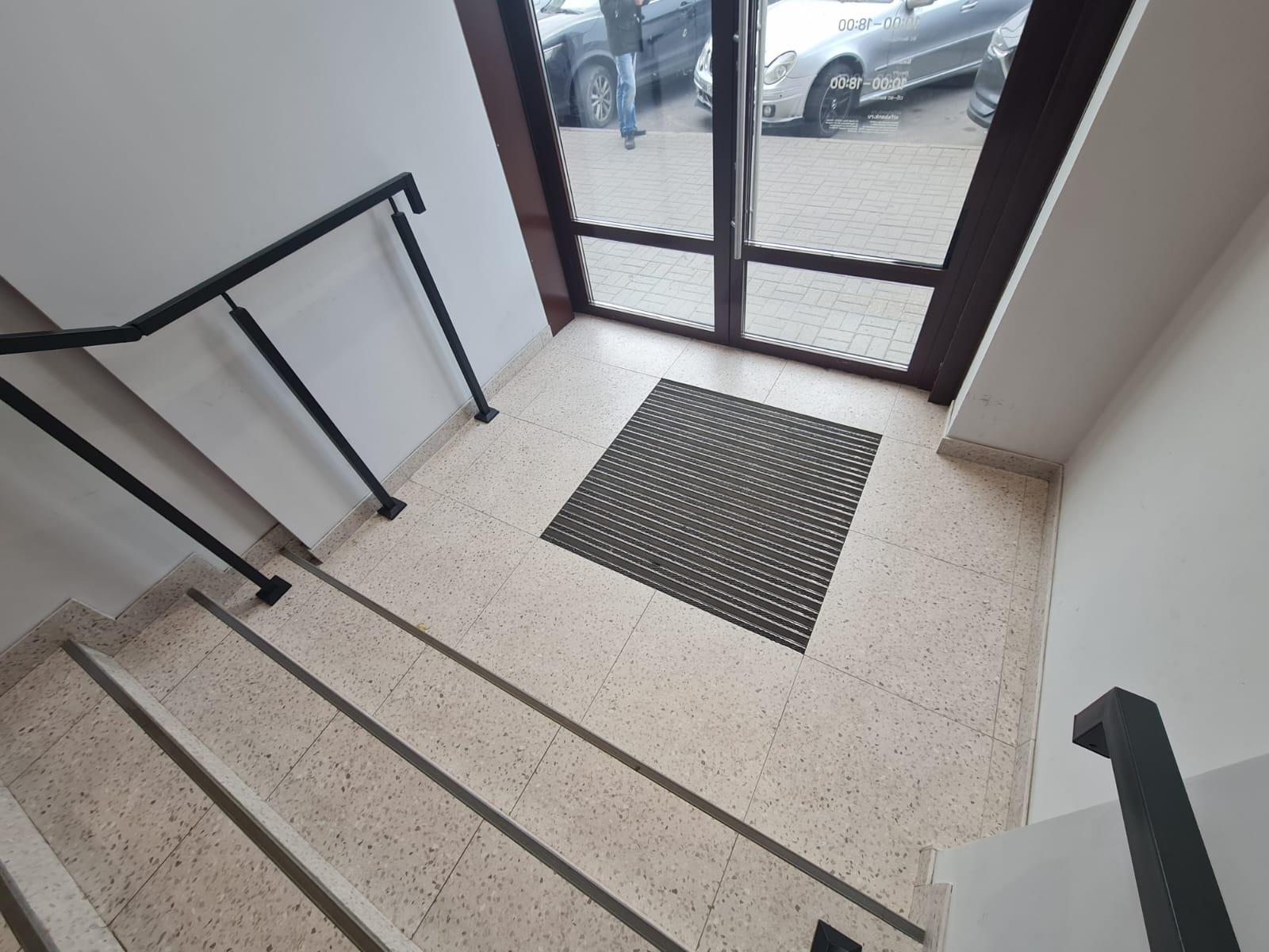Отметим, что установка тактильных наземных указателей перед лестницей на поверхности тротуара не рекомендуется из-за ограниченной ширины тротуара, что может ввести слабовидящих людей в заблуждение и представлять дополнительную опасность. Также не требуется установка тактильных указателей на наружных входных площадках, тамбурах эвакуационных выходов и перед внутренней дверью тамбура в данном банковском отделении.