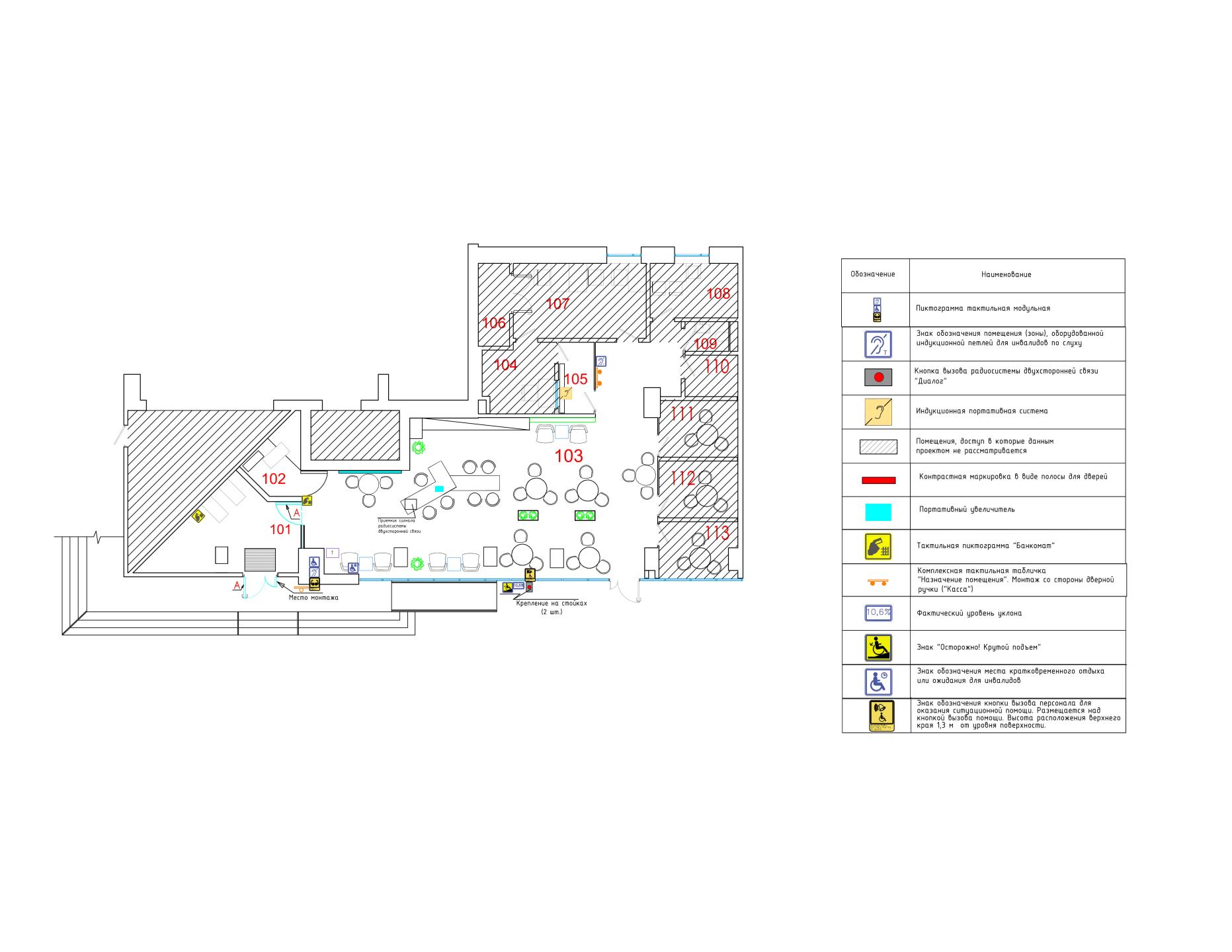В соответствии с требованиями СП 59.13330.2020, технические средства информирования, ориентирования и сигнализации в местах массового посещения должны обеспечивать посетителям возможность однозначной информации о объектах и местах посещения, размещении и функциях элементов, ассортименте и характере предоставляемых услуг, а также обеспечивать надежную ориентацию в пространстве. В проекте предусмотрены тактильные визуальные указатели на путях перемещения МГН, включая знаки доступности входа для инвалидов, обозначения помещений с индукционными петлями для слабослышащих, тактильные пиктограммы "Банкомат" и знаки обозначения мест отдыха для инвалидов.