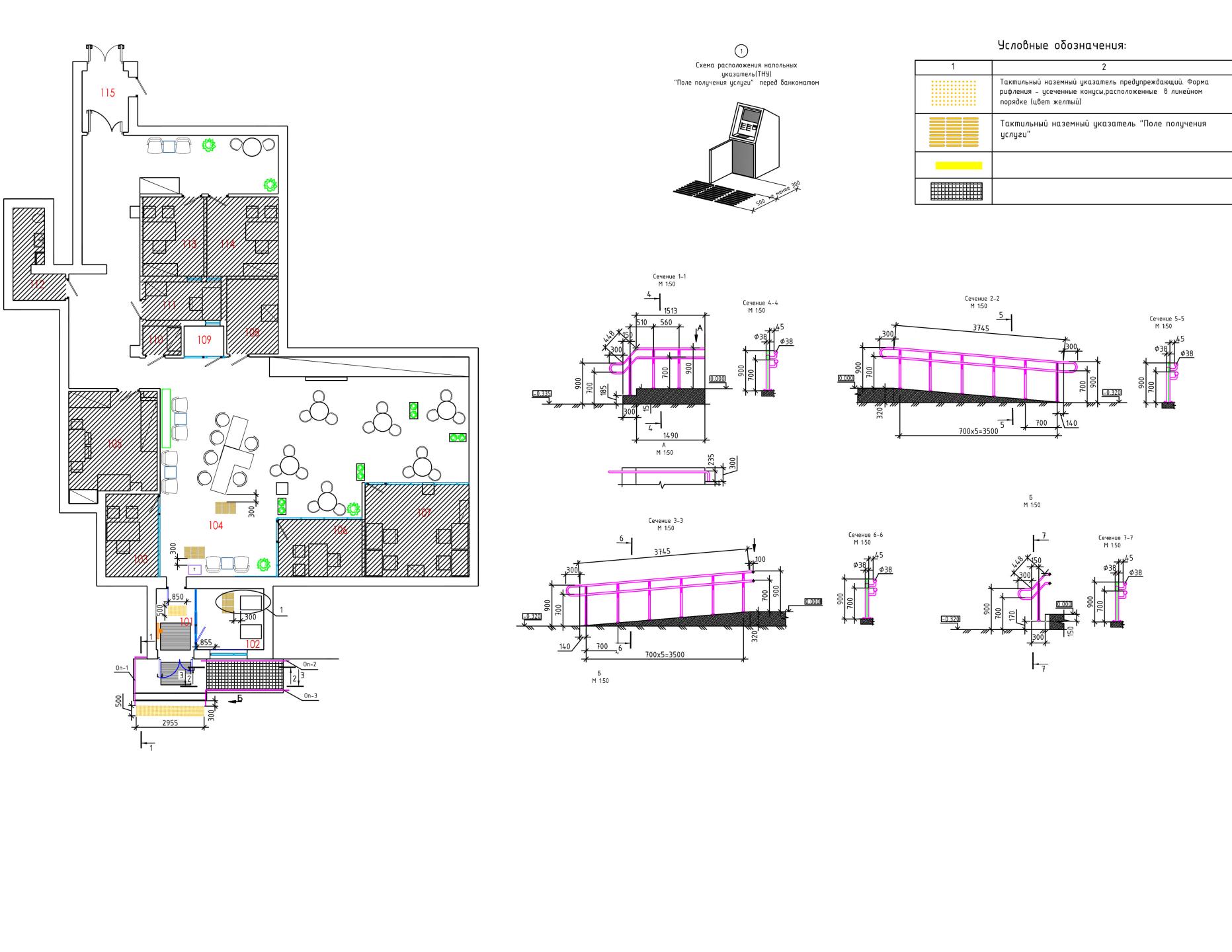 Проектом предусмотрено установка тактильных визуальных указателей на путях перемещения МГН. Эти указатели включают: