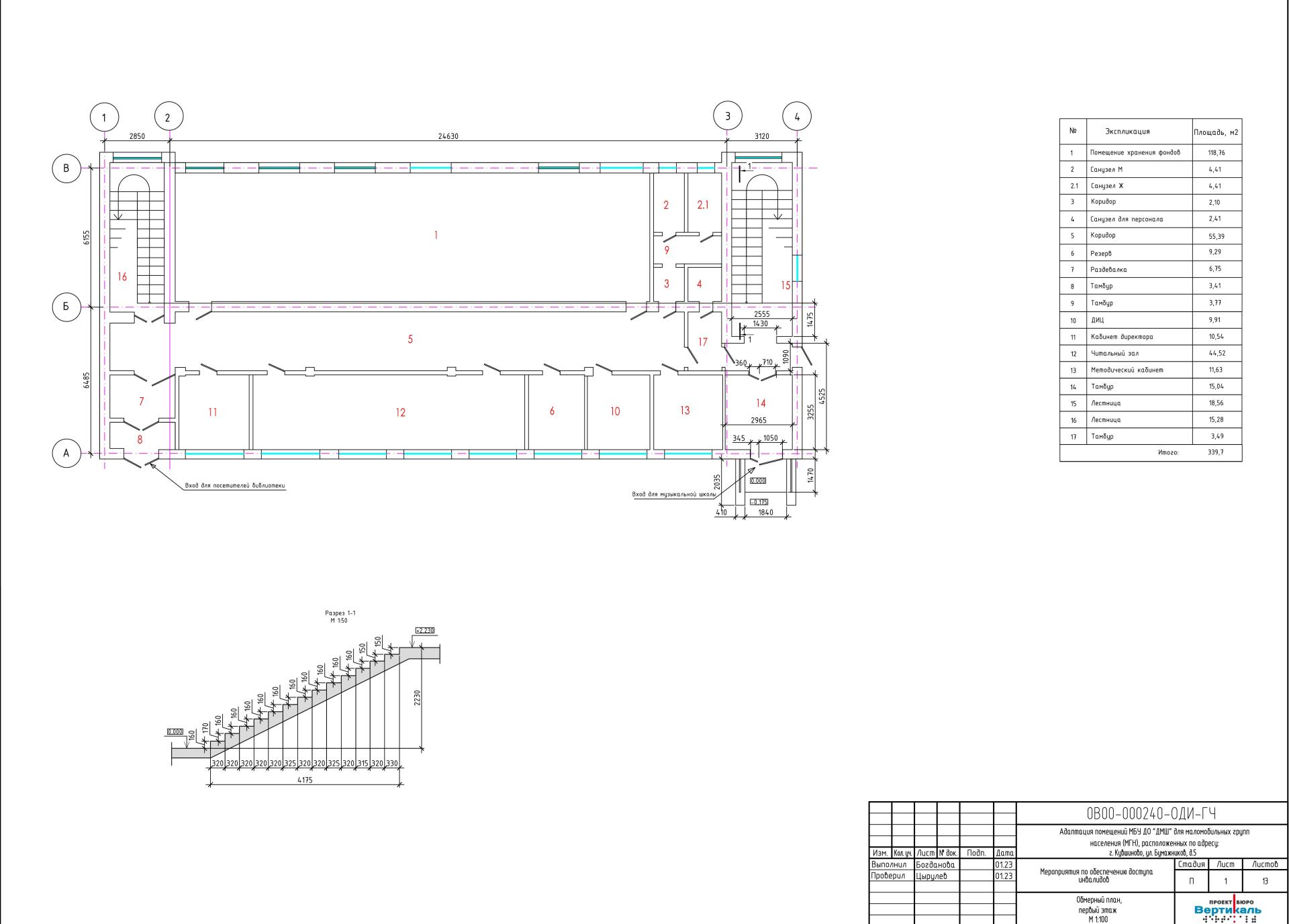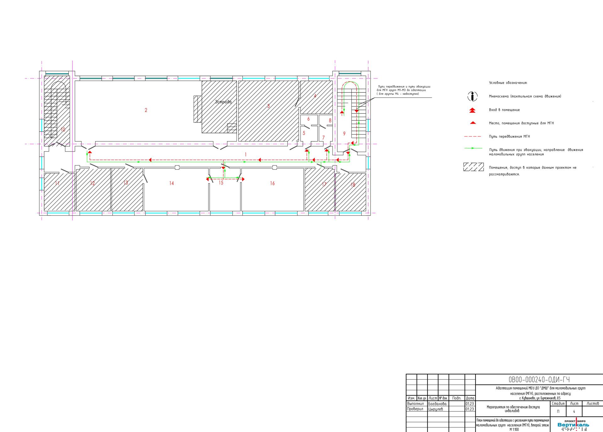 Проект разработан с целью адаптации помещений на Объекте для обеспечения безопасного, информативного и комфортного пути для маломобильных групп населения (МГН) при получении услуг. Входная группа Объекта состоит из крыльца, тамбура (помещение 14) и тамбура (помещение 17). Проект предусматривает различные мероприятия, чтобы обеспечить доступность и удобство для МГН.