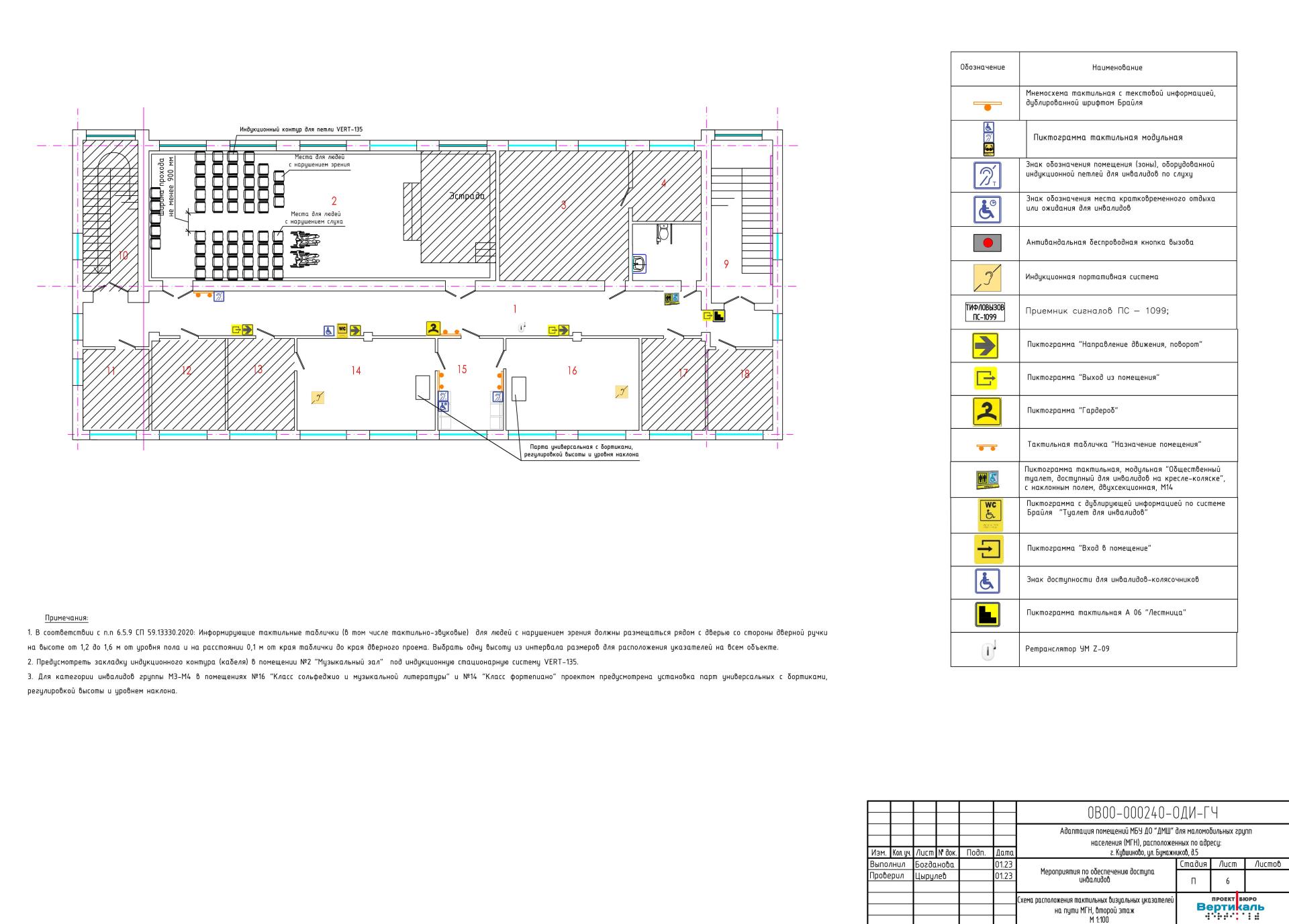 - Размещение тактильной мнемосхемы с планом и назначением помещений с использованием системы Брайля размером 470х610 мм. Тактильная мнемосхема будет размещена справа от входа с улицы в тамбур (помещение 14) на стене на высоте 1,2-1,6 м от уровня пола.