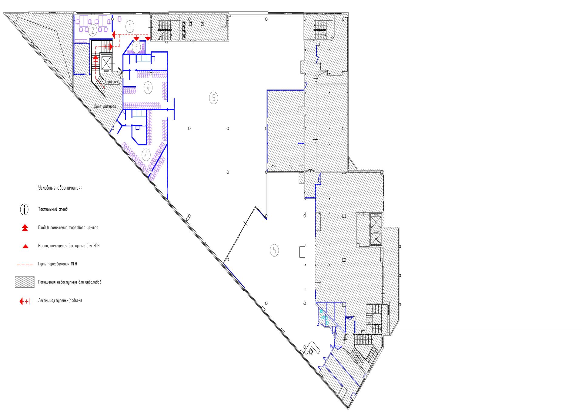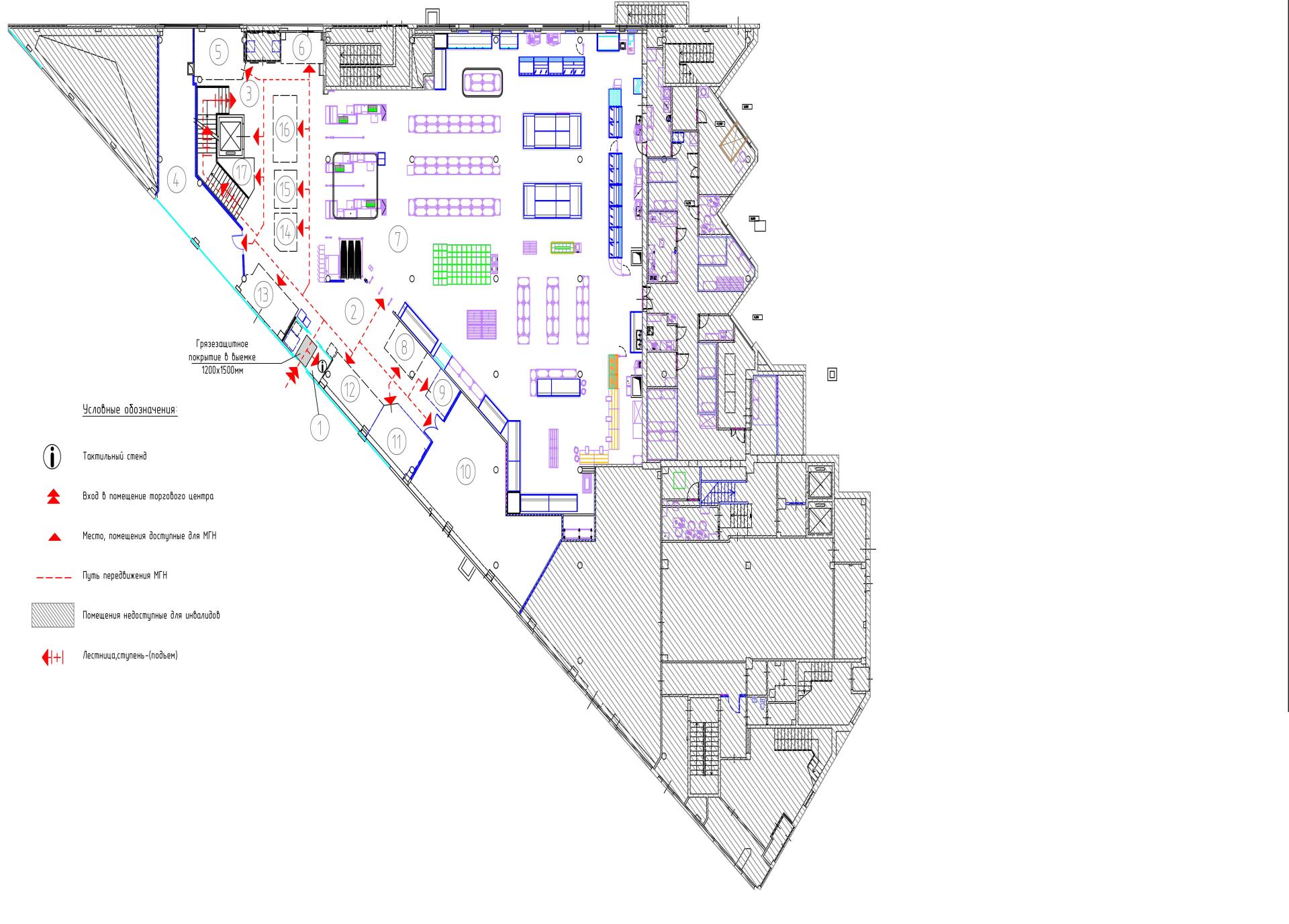 Предоставление МГН своевременной и полноценной информации, необходимой для ориентации в пространстве, использования оборудования (в том числе для самообслуживания), получения услуг и т. д. Проектные решения не ограничивают условия проживания других групп населения, находящихся в помещении торгового центра. Однако данный проект не предусматривает обустройство следующих элементов здания: