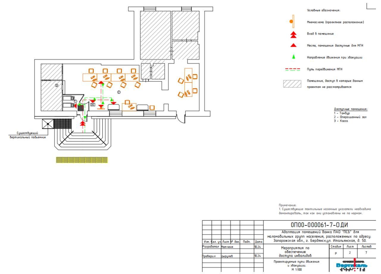 Настоящий проект разработан в целях обеспечения беспрепятственного доступа к помещениям банка для людей с ограниченными возможностями здоровья и маломобильных групп населения (МГН) по принципу «разумного приспособления». Адаптируется эксплуатируемое помещение банка ПАО «ПСБ», расположенное по адресу: Запорожская область, г. Бердянск, ул. Итальянская, д.50.