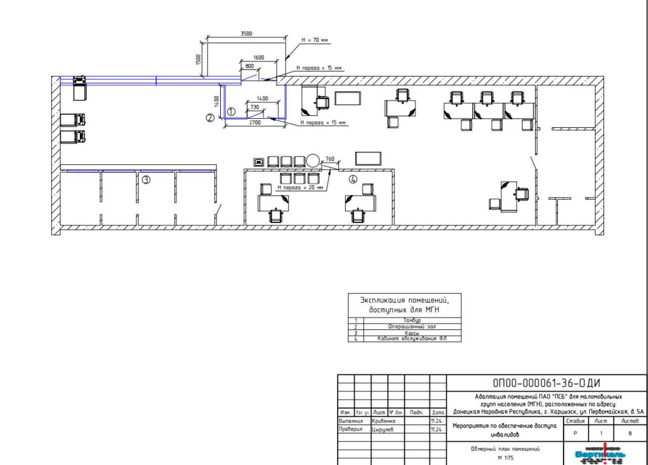 Настоящий проект разработан в целях обеспечения беспрепятственного доступа к помещениям банка для людей с ограниченными возможностями здоровья и маломобильных групп населения (МГН) по принципу «разумного приспособления». Адаптируется эксплуатируемое помещение банка ПАО «ПСБ», расположенное по адресу: Донецкая Народная Республика, г. Харцызск, ул. Первомайская, д. 5А.