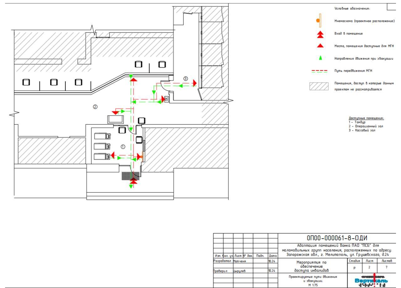 Настоящий проект разработан в целях обеспечения беспрепятственного доступа к помещениям банка для людей с ограниченными возможностями здоровья и маломобильных групп населения (МГН) по принципу «разумного приспособления». Адаптируется эксплуатируемое помещение банка ПАО «ПСБ», расположенное по адресу: Запорожская область, г. Мелитополь, ул. Грушевского, д.24.