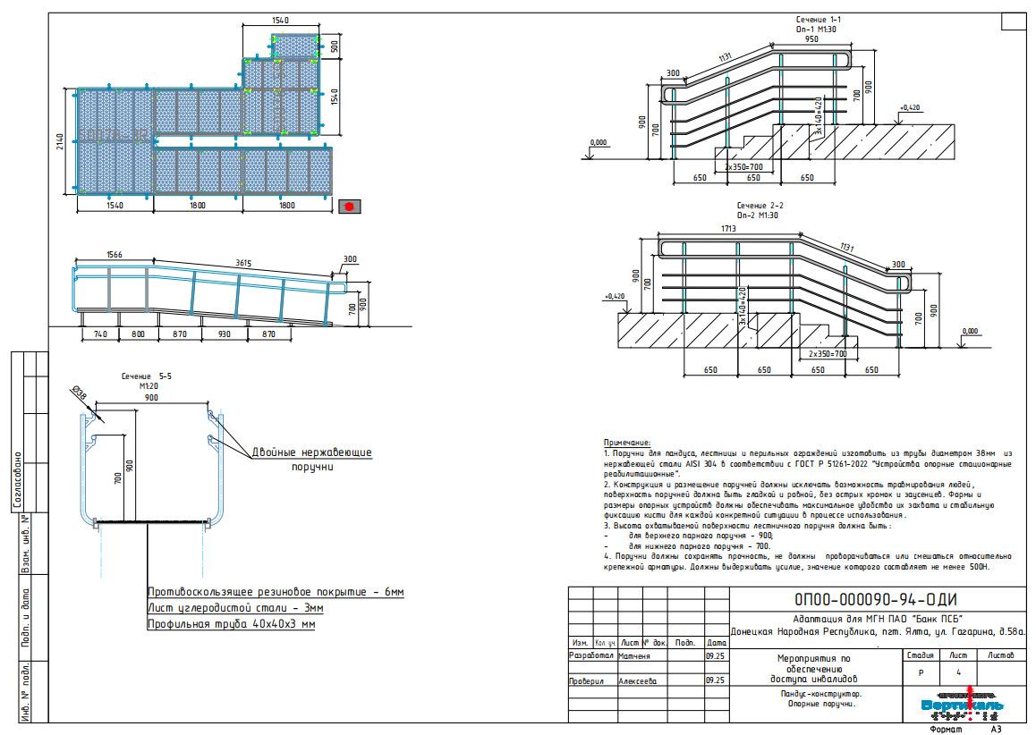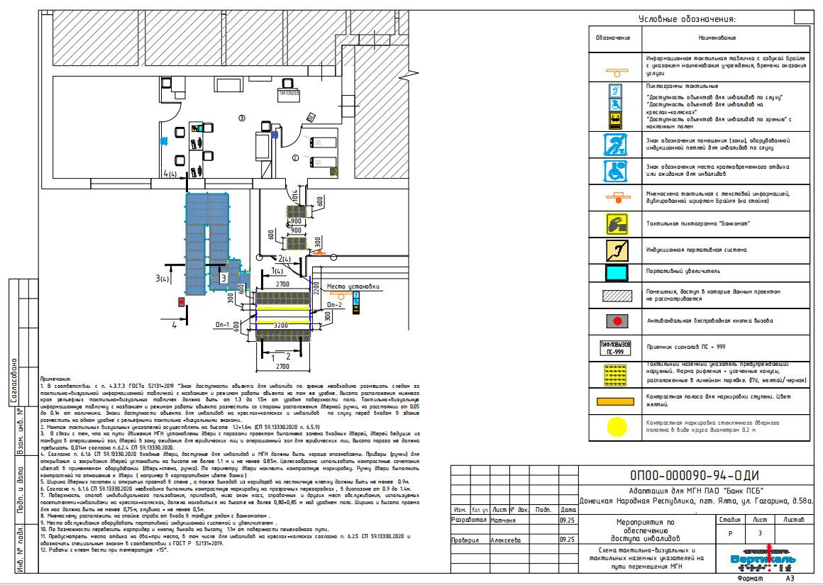 Проект разработан для обеспечения беспрепятственного доступа маломобильных групп населения (МГН) к услугам банка в существующем помещении по адресу: Донецкая Народная Республика, пгт. Ялта, ул. Гагарина, д. 58а.