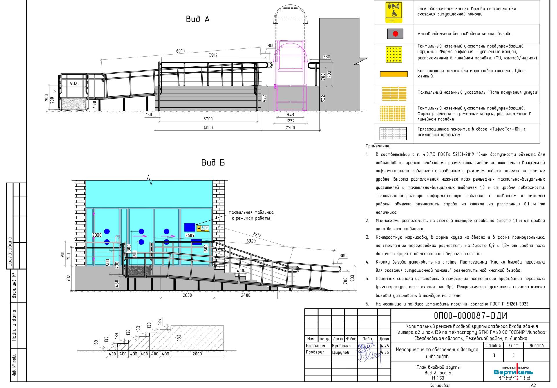 В проекте адаптируется одна входная группа. Производится установка металлического пандуса с уклоном 1:12,5 и вертикального подъемника БК440. На лестнице установлены поручни, соответствующие ГОСТ Р 51261-2022.
