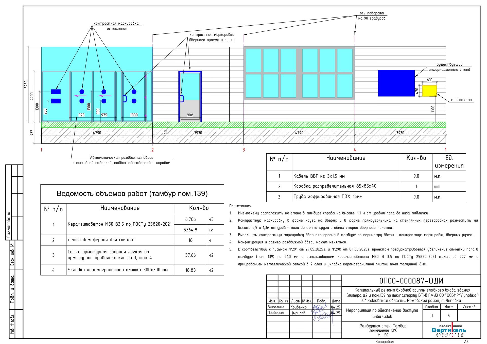 Настоящий проект разработан в целях обеспечения беспрепятственного доступа к помещениям объекта для людей с ограниченными возможностями и маломобильных групп населения (МГН) по принципу «разумного приспособления». Разработана проектная документация «Капитальный ремонт входной группы главного входа здания (литера А2 и пом. 139 по техпаспорту БТИ) ГАУЗ СО «ОСБМР «Липовка»» по адресу Свердловская область, Режевской район, п. Липовка.