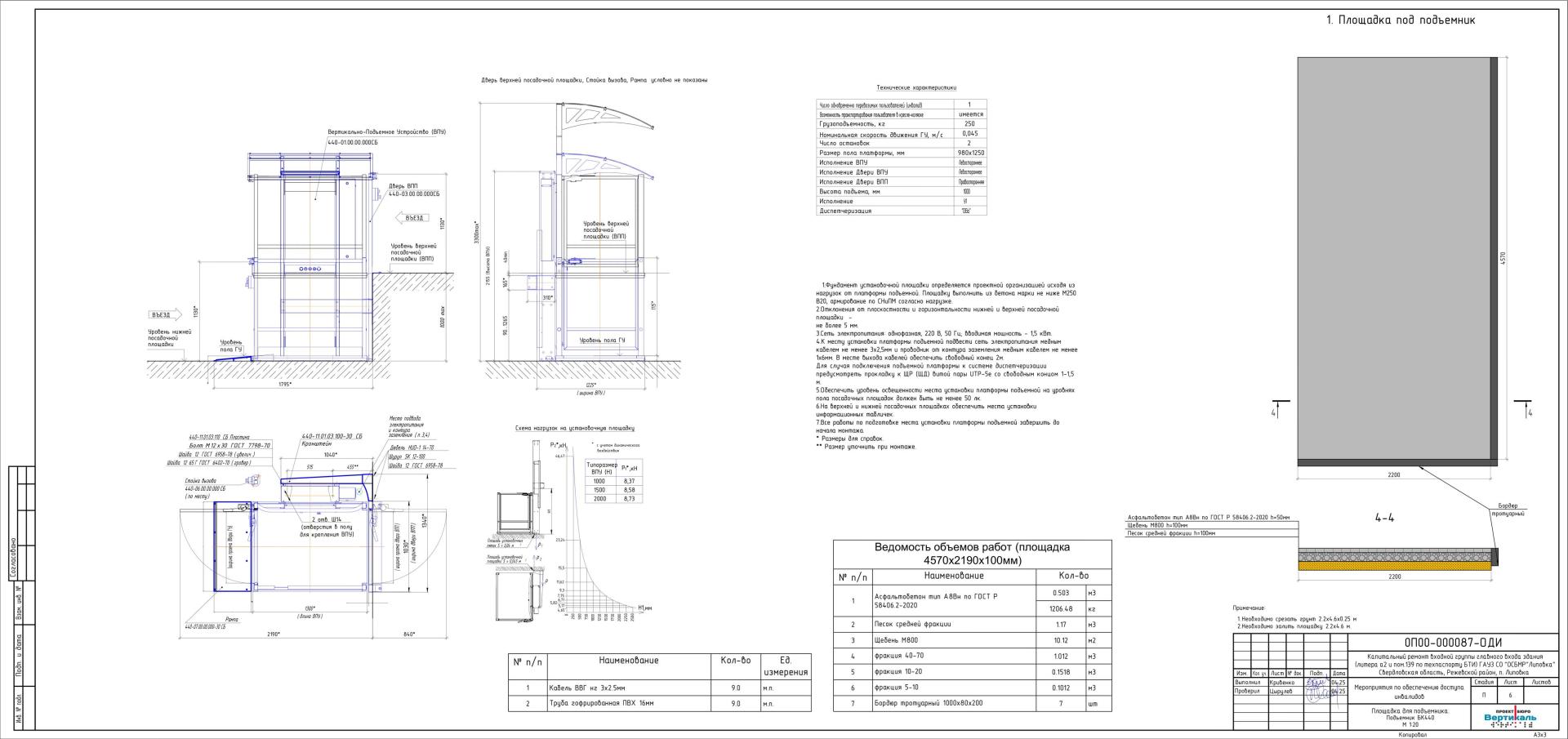 - Устройство площадки в месте последующего монтажа подъемной платформы размерами 2,2х4,6 м. с покрытием из асфальтобетона.