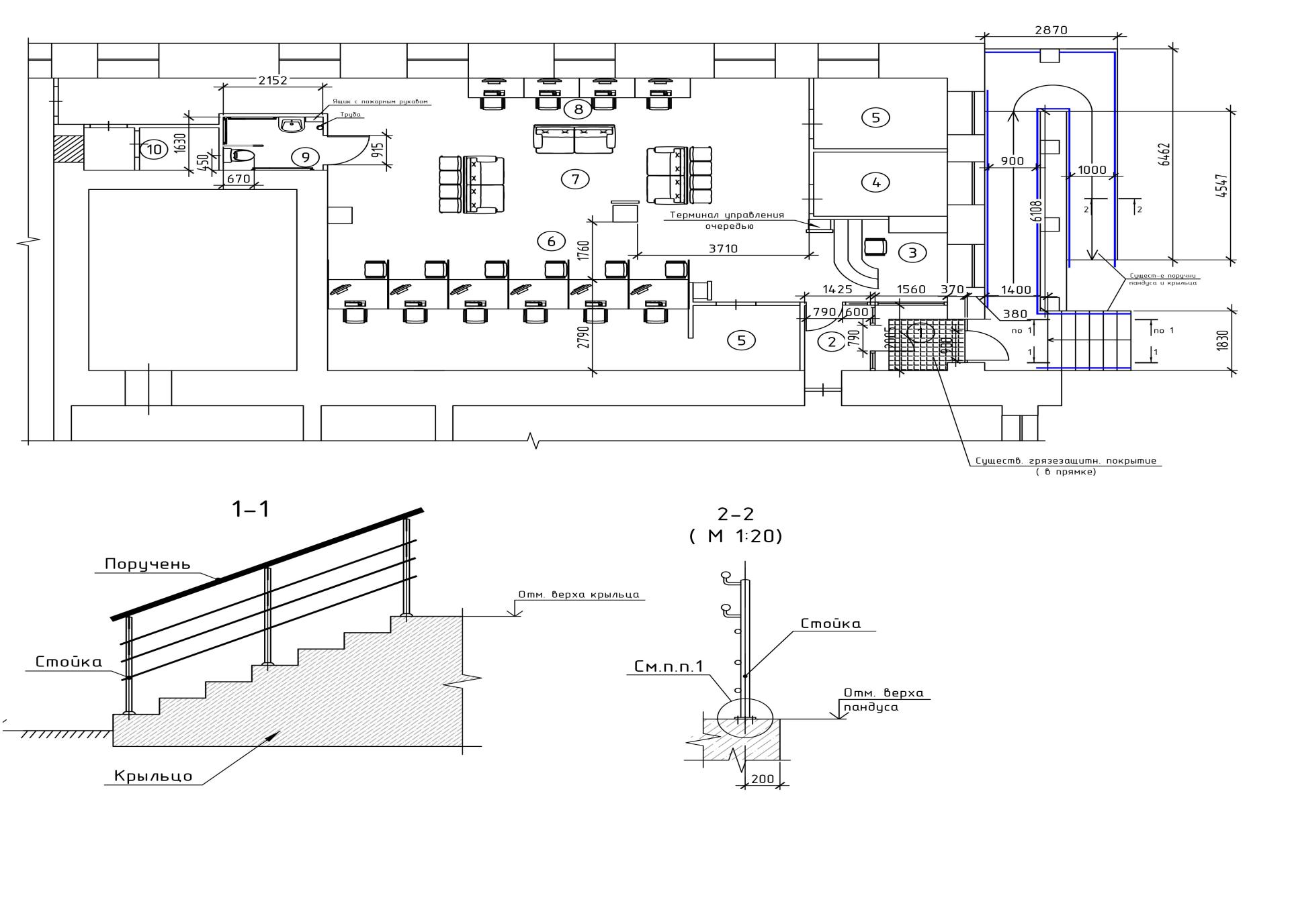 - Входная площадка должна иметь размер не менее 2,2 х 2,2 м, согласно требованиям СП 59.13330-2012. В связи с невозможностью изменения размеров входной площадки из-за наличия несущей колонны, принято решение адаптировать входную группу на основании принципа "разумного приспособления". Для обеспечения безопасности и удобства МГН будет установлена кнопка вызова помощи на пандусе и площадке входной группы. Вход и выход в здание будут осуществляться при сопровождении персоналом КУ НАО "МФЦ". Также будет установлена тактильная кнопка вызова помощи на уровне 0,85-1,1 м от уровня пешеходной поверхности.