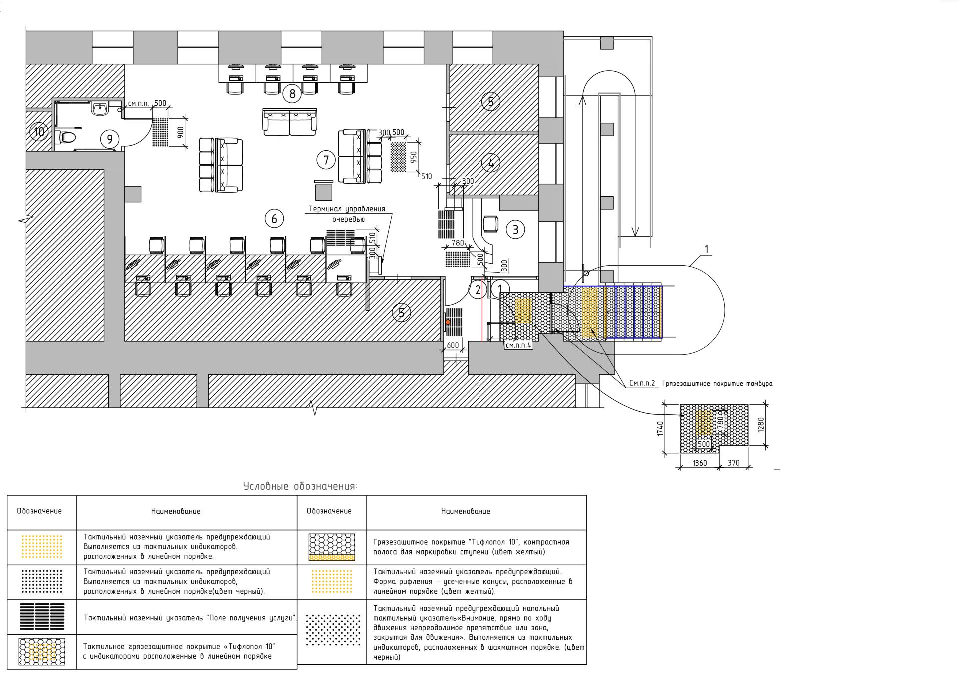 В соответствии с СП 59.13330.2020 требуется обеспечить посетителям объекта возможность однозначной информации о размещении объектов и мест посещения, а также обеспечить надежную ориентацию в пространстве. Для этого будут установлены тактильные визуальные указатели на путях перемещения МГН: