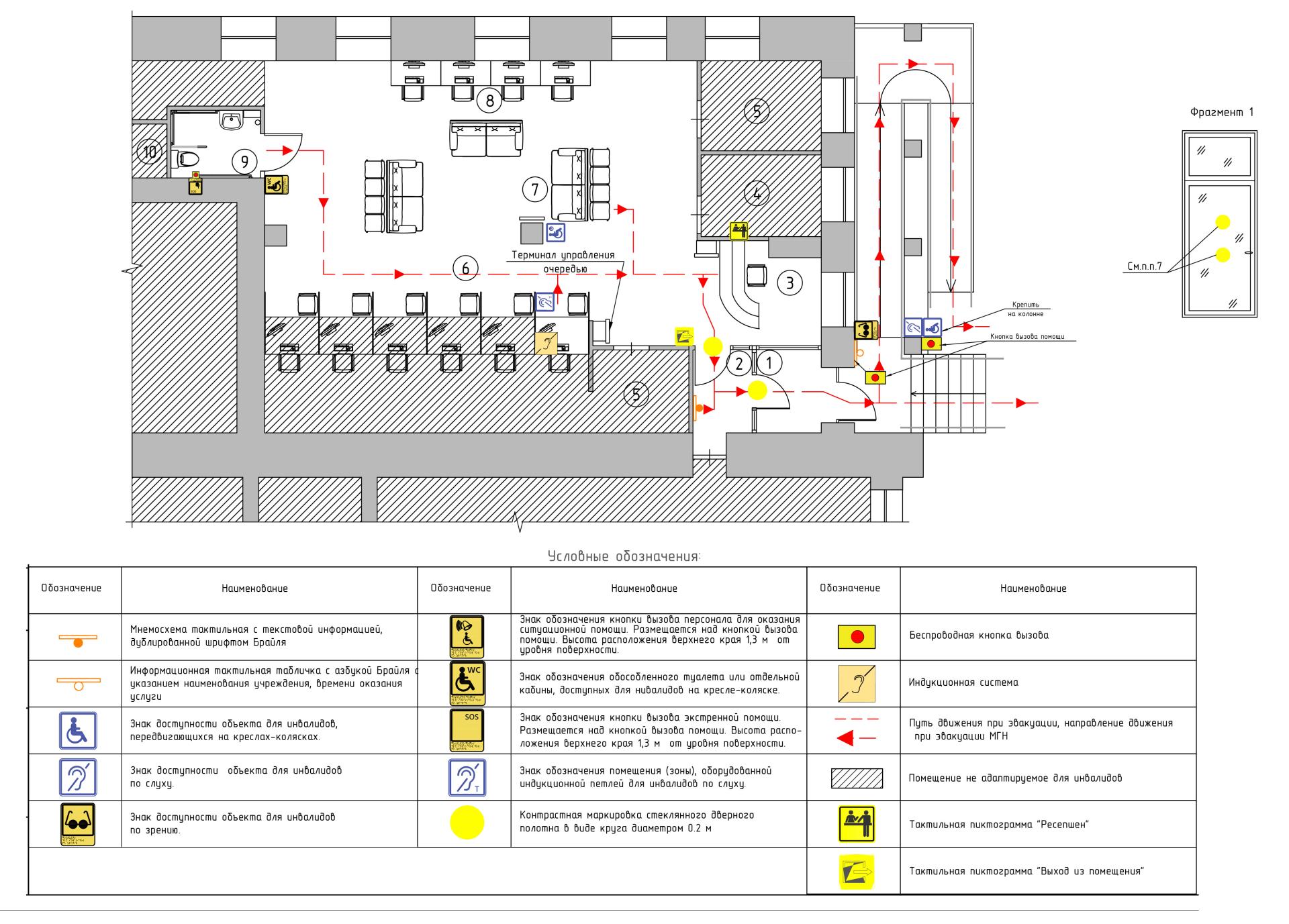Обеспечение доступности мест назначения с использованием кратчайшего пути, свободного перемещения внутри здания, безопасности маршрутов и обслуживающих зон, а также предоставление МГН полноценной и качественной информации, необходимой для ориентации в пространстве, использования оборудования и получения услуг. Проектные решения не ограничивают условия жизни и возможности других групп населения в здании. После реализации предусмотренных мероприятий маломобильные группы населения смогут свободно перемещаться по зданию.