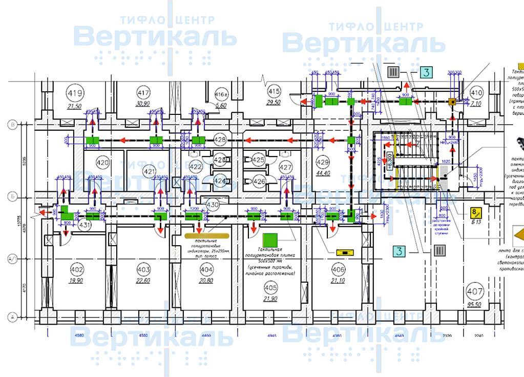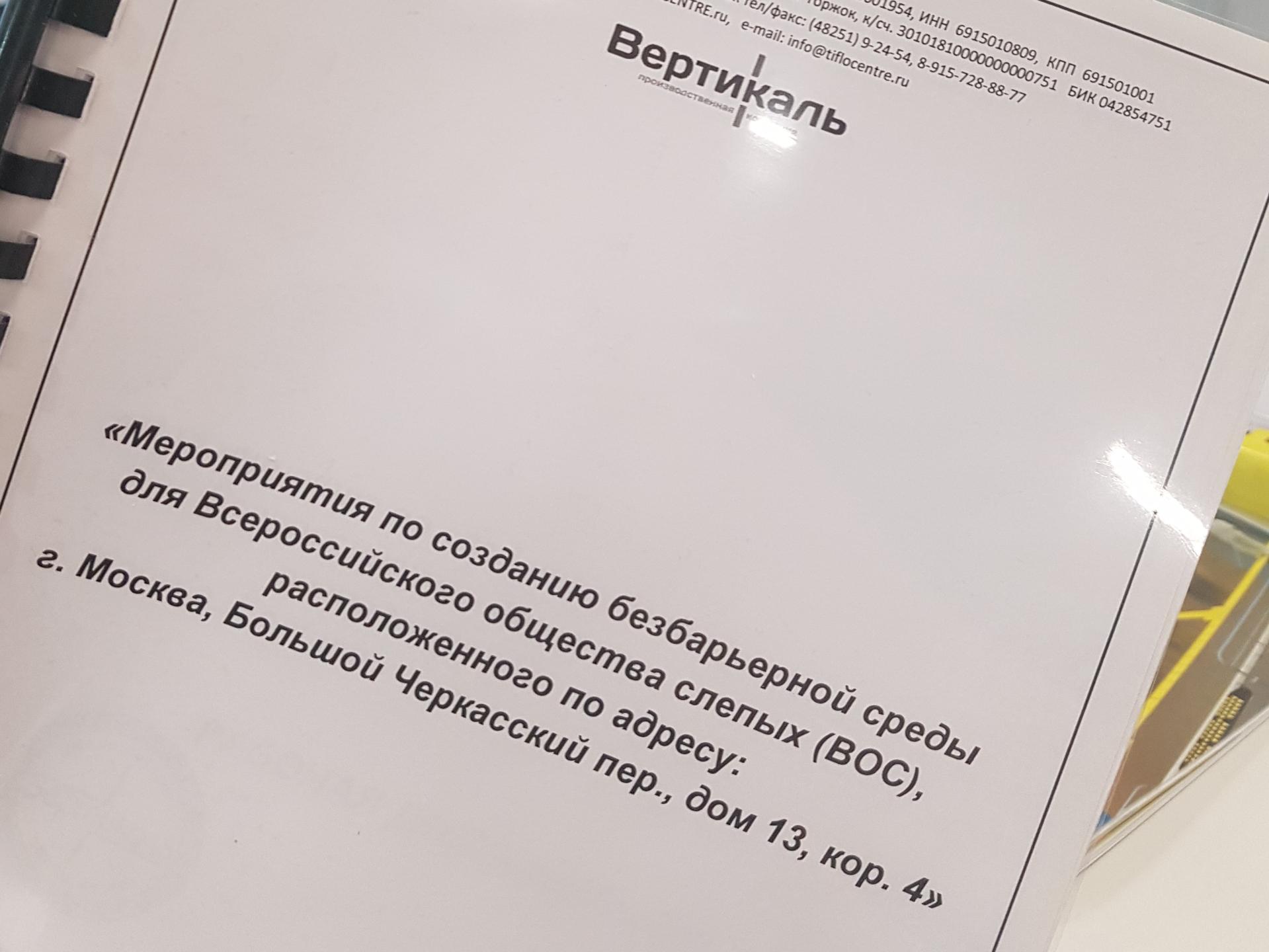 Специалистами Тифлоцентра «Вертикаль» был проведен комплекс работ по организации безбарьерного пространства людей с ограничениями на всех этажах здания ВОС. Для этого был произведен монтаж тактильных пиктограмм (1-4 этаж), тактильно-звуковой мнемосхемы (плана) помещений на первом этаже, а также направляющих металлических тактильных индикаторов.