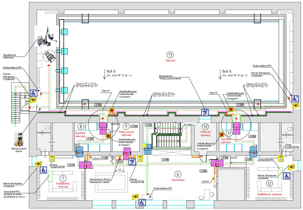 - Душевые. Адаптированы существующие кабинки в мужской и женской душевых. Проектом предусмотрено создание пространства для душа не менее 0,9x1,2 м, установка откидных сидений, опорных поручней и регулируемых душевых стоек.