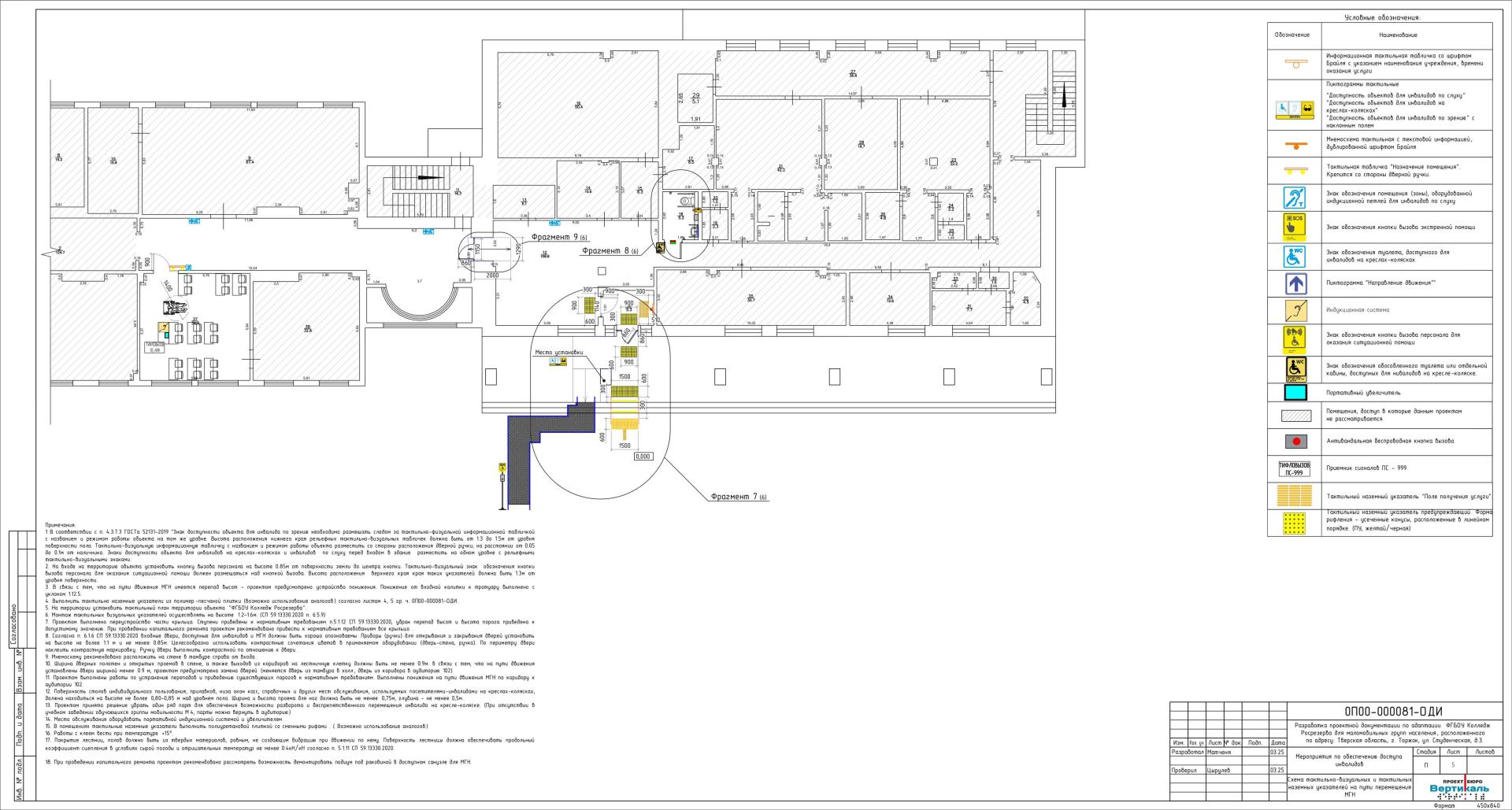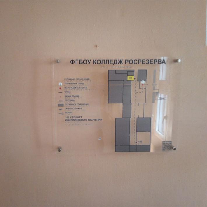 В рамках комплекса мероприятий по адаптации для людей с нарушением зрения предусмотрено создание многоуровневой системы навигации. Для надежной ориентации в пространстве на путях перемещения маломобильных групп населения устанавливаются тактильные настенные указатели. Система включает тактильно-визуальные таблички с дублированием информации шрифтом Брайля, содержащие наименование учреждения и режим работы, а также информационные планы территории и тактильные мнемосхемы с планом и назначением помещений. Дополняют систему знаки доступности объекта для инвалидов различных категорий и тактильные таблички обозначения зоны или помещения с выпуклым текстом и брайлевским дублированием, размещаемые на высоте 1,3 метра от уровня пола.