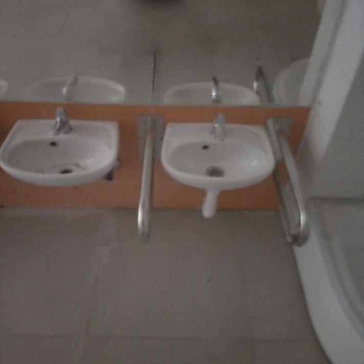- Адаптация санитарно-бытового помещения. В лабораторном корпусе оборудуется санузел для маломобильных групп населения с соблюдением требований п.6.3.7 СП 59.13330.2020: свободное пространство диаметром 1,4 м для разворота кресла-коляски; пространство шириной не менее 0,8 м сбоку от унитаза для размещения кресла-коляски; установка стационарных и откидных опорных поручней; высота раковины 0,80-0,85 м над уровнем пола с проемом для ног не менее 0,75×0,5 м; водопроводные краны с рычажной рукояткой и термостатом.