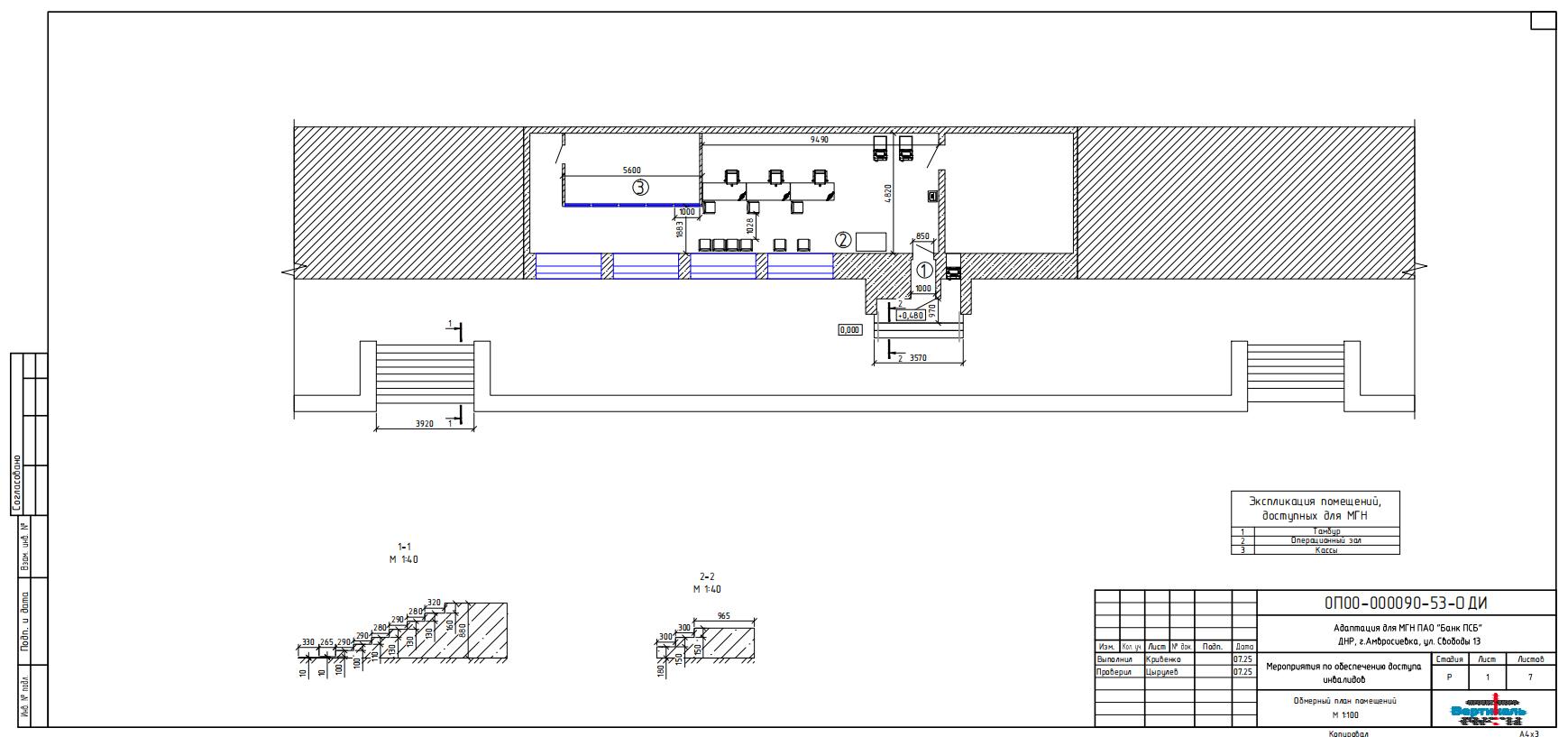Адаптации подлежит эксплуатируемое помещение банка ПАО «Банк ПСБ», расположенное в городе Амвросиевка. Проектная документация разработана на основании технического задания заказчика, данных натурного обследования и в строгом соответствии с актуальными требованиями СП 59.13330.2020, ГОСТ Р 52131-2019 и других нормативных документов.