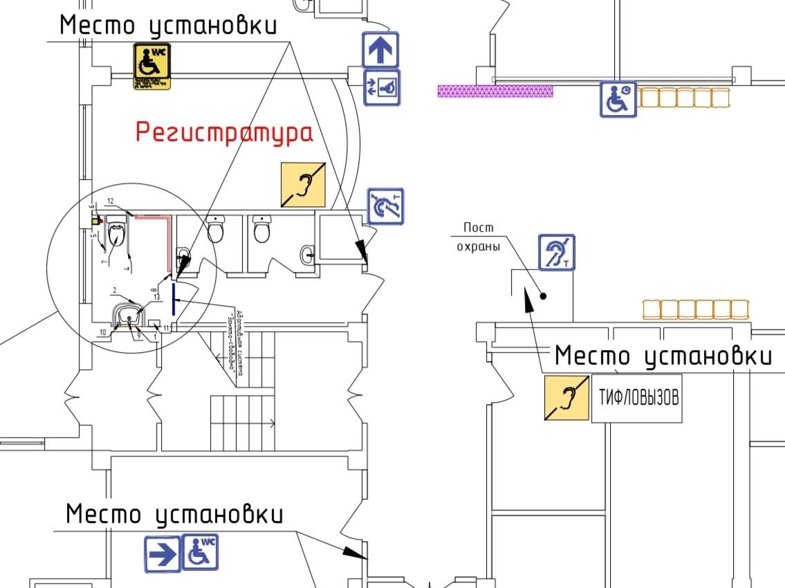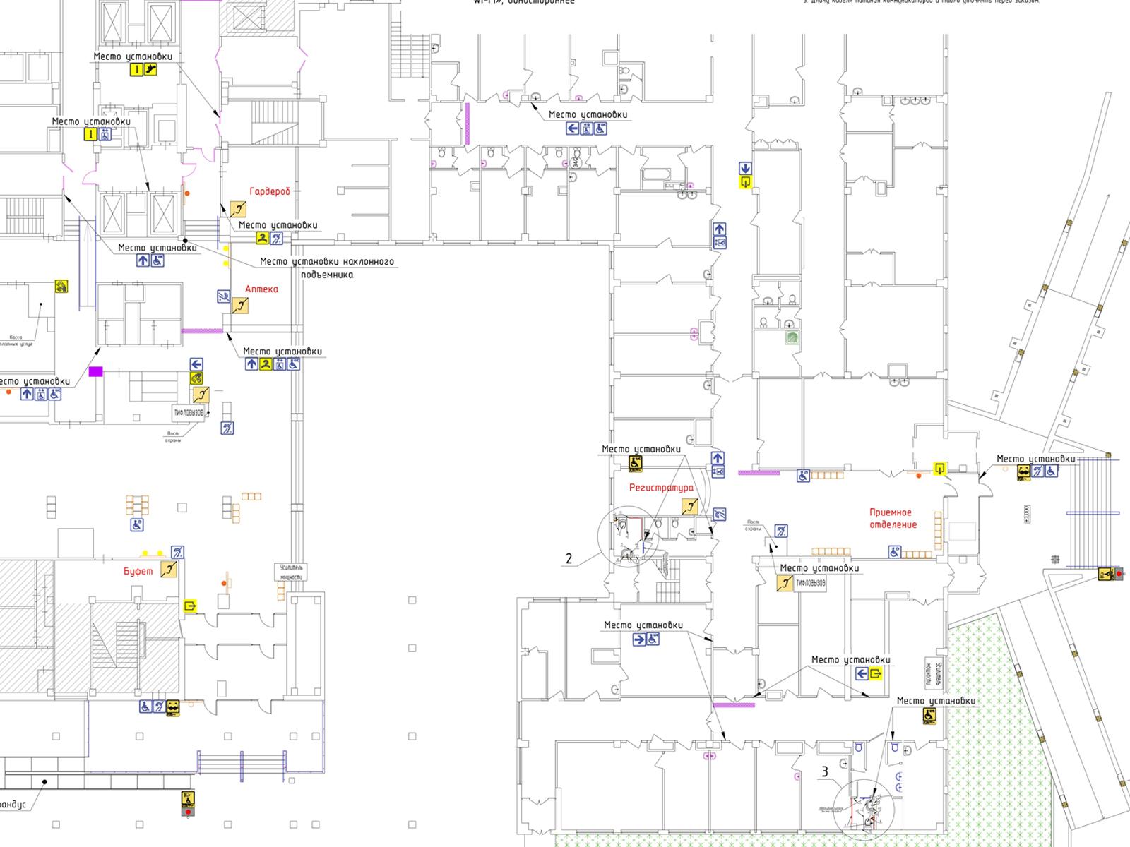 - Тактильная мнемосхема с планом и назначением помещений, дублирующая информацию тактильным плоскопечатным способом по системе Брайля (размер 470 х 610 мм). Размещение тактильной мнемосхемы осуществляется согласно проекту.