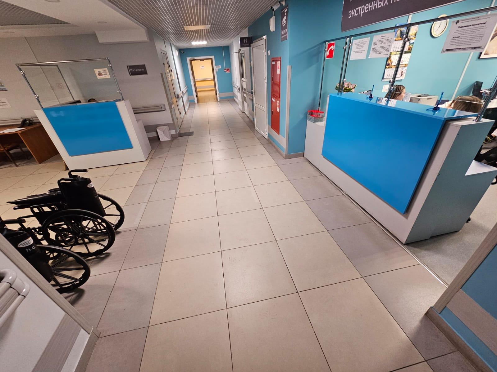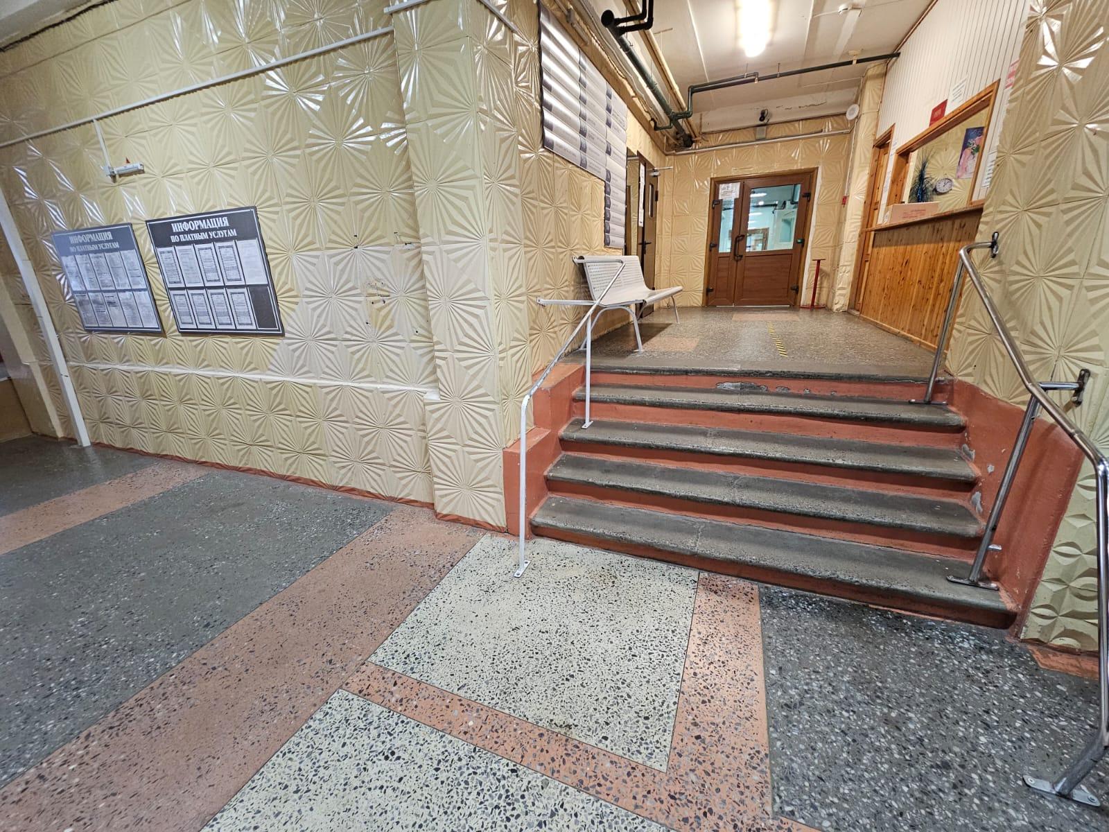 Также предусмотрено размещение кнопок вызова персонала на парковочных местах, выделенных для МГН, перед заездом на пандус и входом в приемное отделение. Доступ в приемное отделение для инвалидов на креслах-колясках осуществляется с помощью мобильного лестничного подъемника. По поступлении вызова с кнопки вызова персонала, расположенной на приемных местах, сотрудник окажет помощь инвалиду на кресле-коляске.