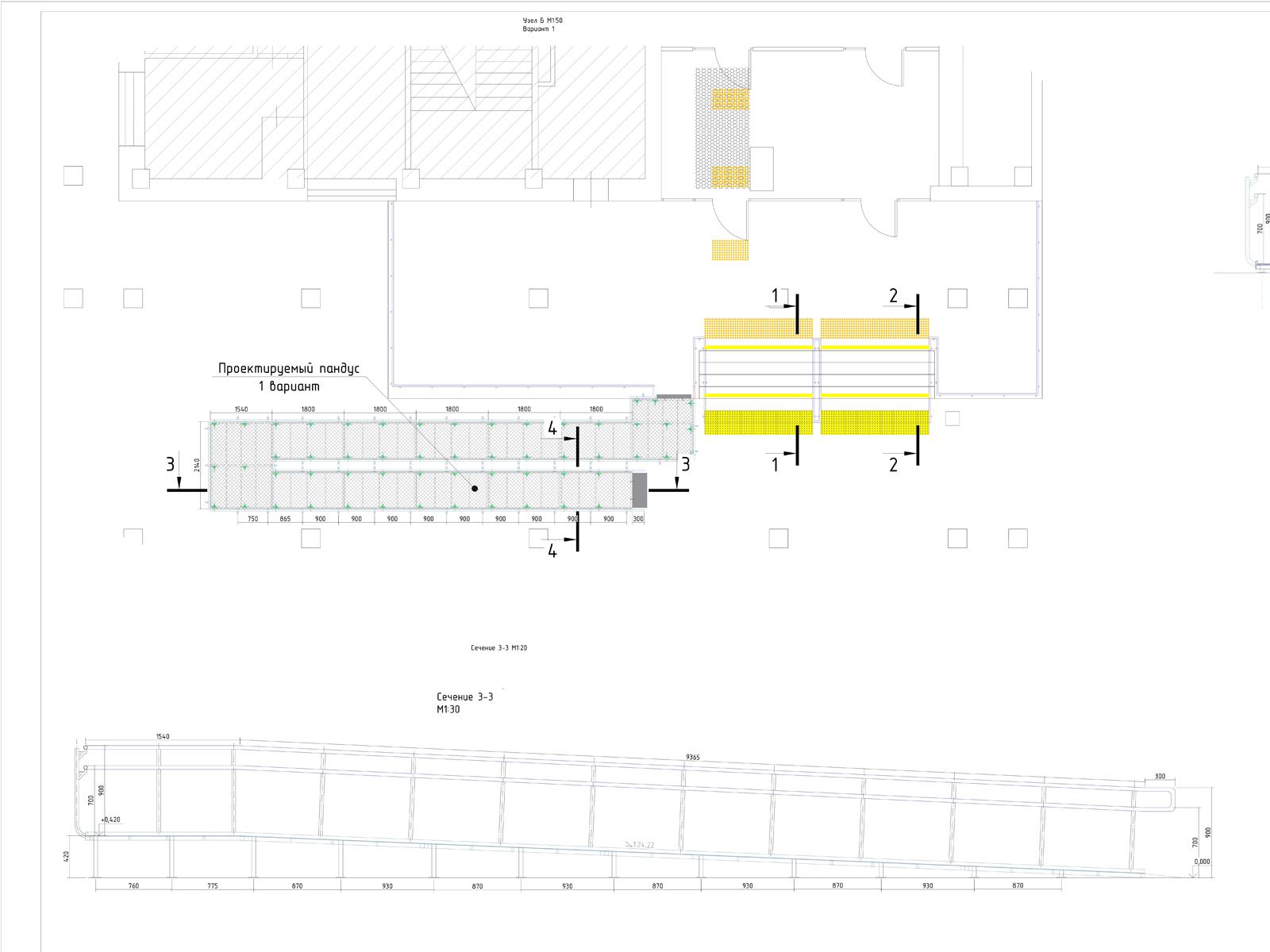 Для обеспечения безопасного и безбарьерного пути следования для МГН и инвалидов на кресле-коляске проектом предложены два варианта пандус-конструктора. Конструкция поручней должна отвечать требованиям СП 59.13330.2020 и ГОСТ Р51261-2017. Опорные поручни выполнить на высотах 0,7 и 0,9 метра. Диаметр поручня принят проектом 38мм, что является оптимальным для обхвата руки. Конструкция опорной части по всей длине является непрерывной.