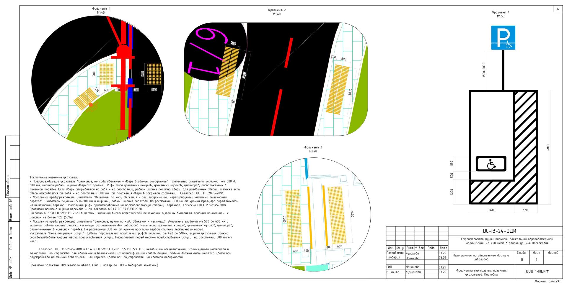 В соответствии с п.5.1.10 СП 59.13330.2020 проектом предусмотрена установка тактильно-контрастных наземных указателей по ГОСТ Р 52875 на пути следования от парковки до входа в дошкольную образовательную организацию: