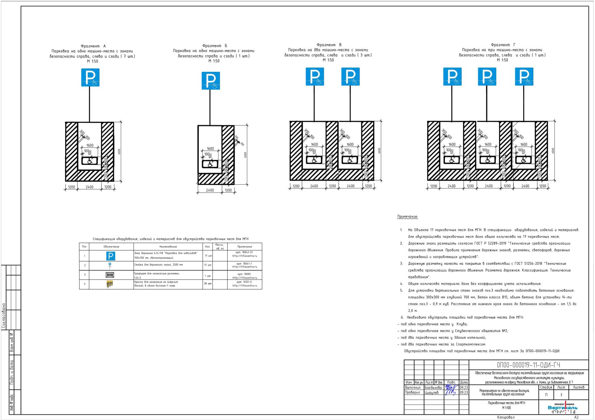 Согласно проекту, необходимо обустроить парковки для МГН по маршруту движения автотранспорта. Количество и месторасположение парковочных мест для автотранспорта МГН согласовано с заказчиком. Необходимо обустроить площадки под парковочные места для МГН: одно парковочное место у клуба; одно парковочное место у студенческого общежития №2; два парковочных места у здания котельной; два парковочных места за спорткомплексом.