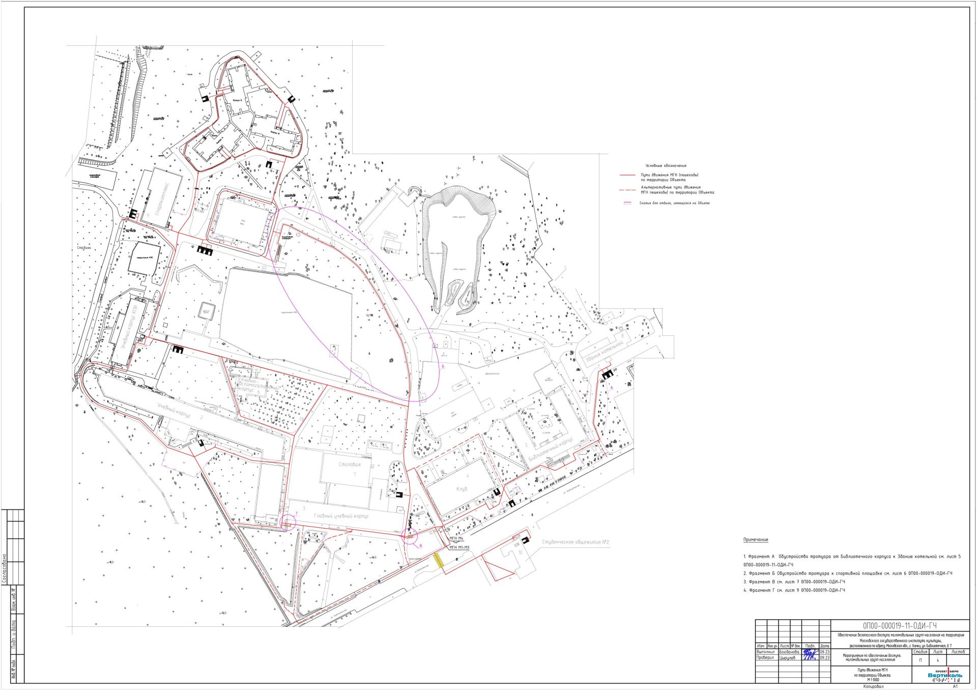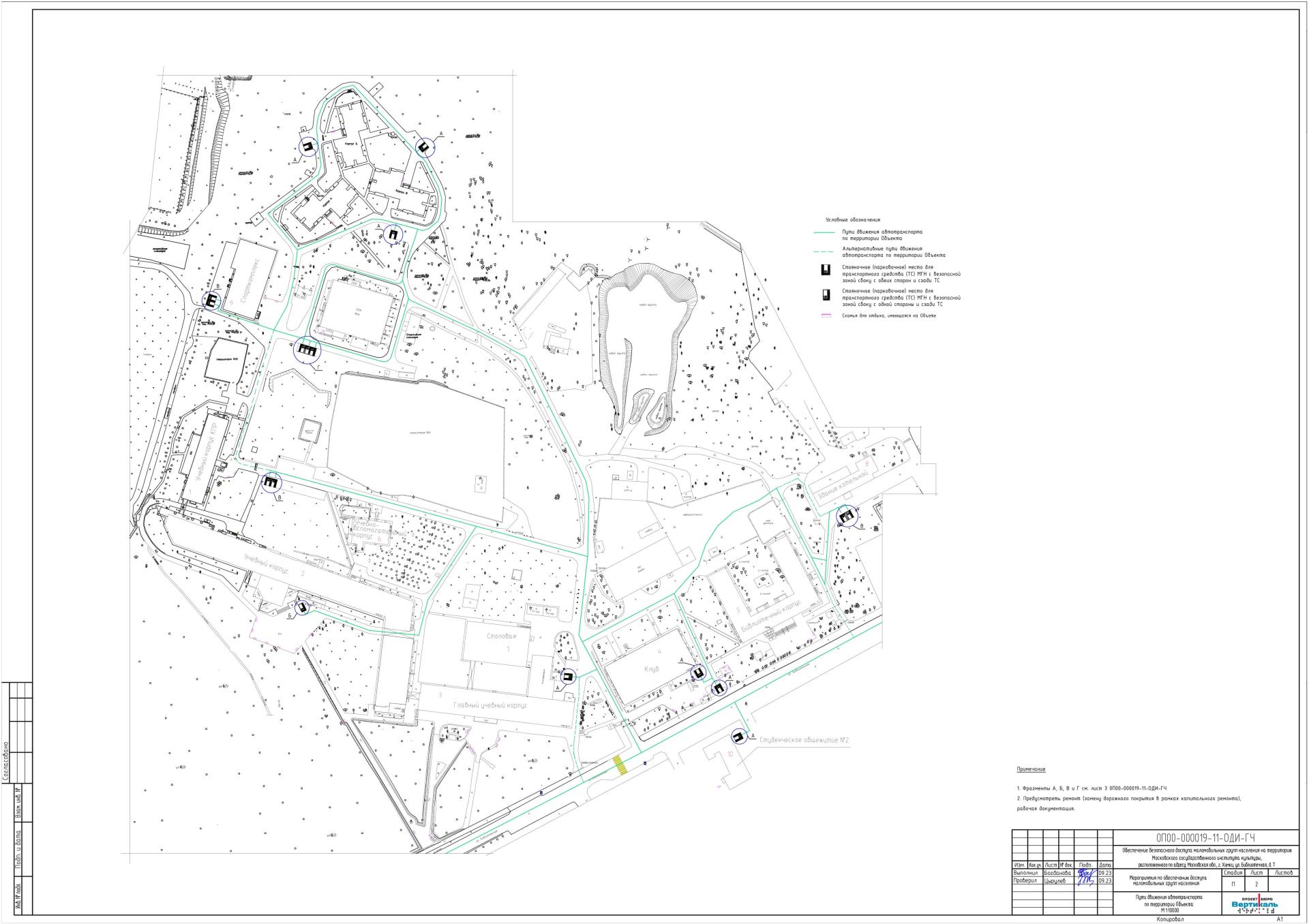 После реализации мероприятий, предусмотренных проектом, будет обеспечиваться возможность безбарьерного следования инвалидов групп мобильности М1-М4 от центрального входа на территорию (КПП-1) и от альтернативного входа на территорию (КПП2) к требуемым корпусам Объекта.