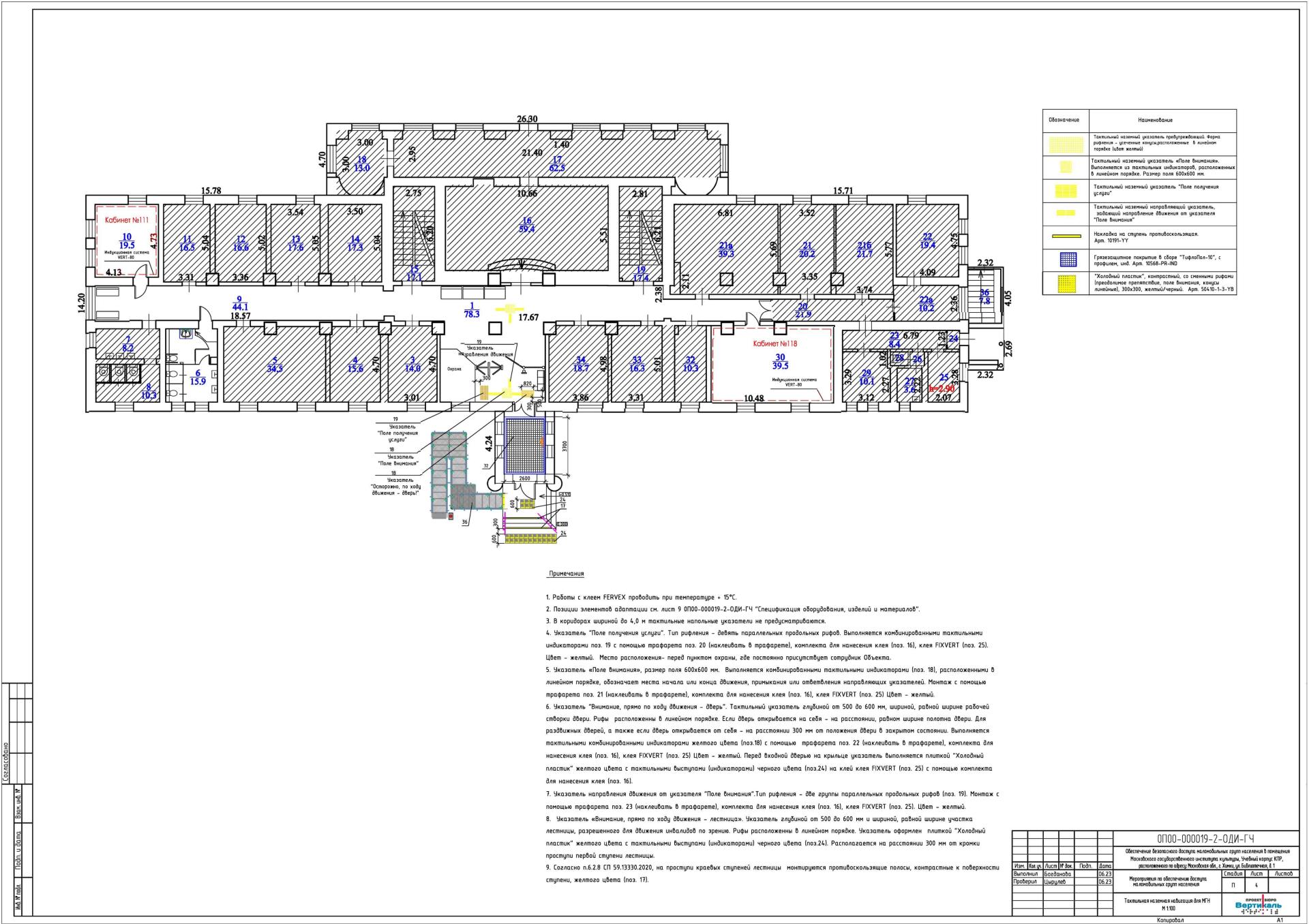 На первом этаже объекта правый и левый входы в коридоры оборудованы ступенями. Для МГН М4 на ступени по проекту устанавливаются подставные пандусы индивидуального изготовления. Согласно п.6.2.9 СП 59.13330.2020, продольный уклон инвентарного пандуса должен быть не более 1:12, в данном случае это невозможно, так как расчетные длины пандусов будут мешать открыванию находящихся рядом дверей в помещения 4, 28, 62, 35. Пандусы переносные,устанавливаются при необходимости, постоянно находятся на хранении во вспомогательном помещении. Согласно п. 6.2.10 СП 59.13330.2020, тактильные контрастные напольные указатели перед пандусами не предусматриваются.