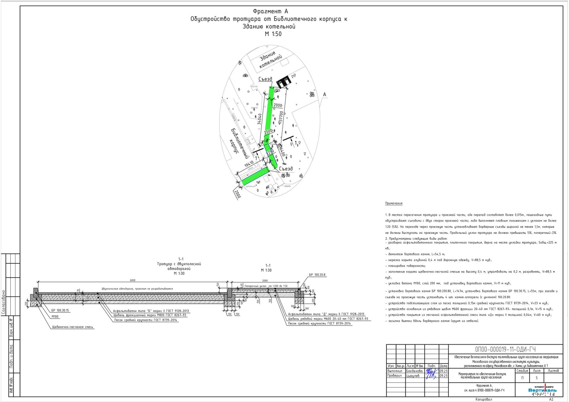 В проекте заложены работы по обустройству тротуара от Библиотечного корпуса к зданию котельной. Ширина тротуара равна 2,0 м. Примыкания тротуара к имеющемуся тротуару на объекте и проезжей части (предусмотрена вдоль тротуара, проектом не разрабатывается) выполнить в одном уровне, допускается разница отметок не более 14 мм. В местах пересечения тротуара и проезжей части, где перепад составляет более 0,015м., пешеходные пути обустраивают съездами с двух сторон проезжей части, либо выполняют плавным понижением с уклоном не более 1:20 (5%). На переходе через проезжую часть устанавливают бордюрные съезды шириной не менее 1,5м, которые не должны выступать на проезжую часть. Продольный уклон тротуара не должен превышать 5%, поперечный 2%.