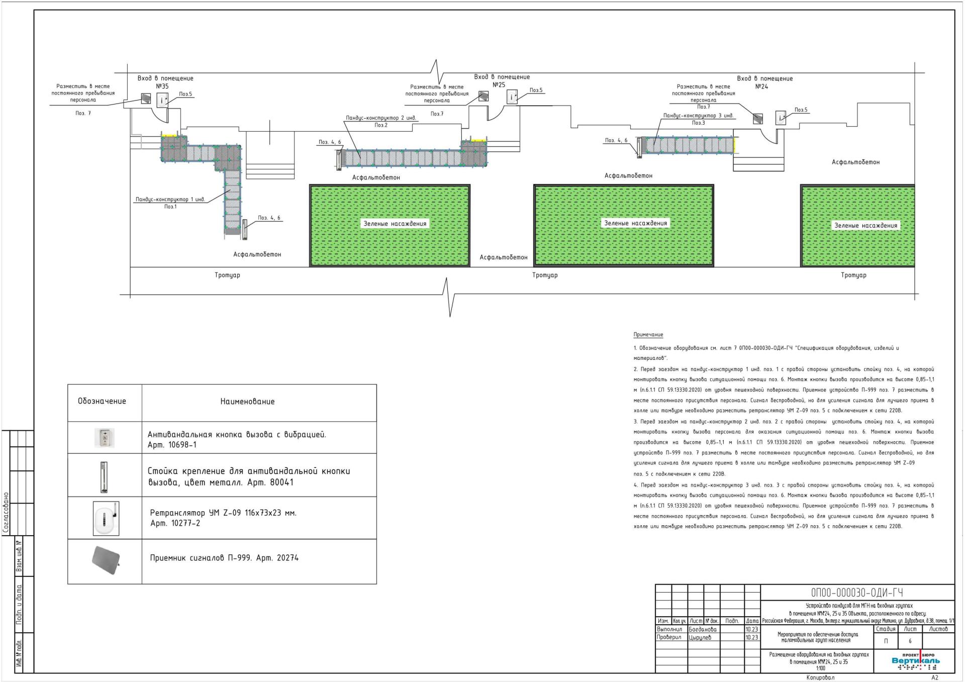 Перед заездом на пандус-конструктор с правой стороны будет установлена стойка с кнопкой вызова ситуационной помощи. Монтаж кнопки вызова производится на высоте 0,85-1,1 м (п.6.1.1 СП 59.13330.2020) от уровня пешеходной поверхности. Приемное устройство П-999 разместить в месте постоянного присутствия персонала. Сигнал беспроводной, но для усиления сигнала для лучшего приема в холле или тамбуре необходимо разместить ретранслятор УМ Z-09 с подключением к сети 220В.