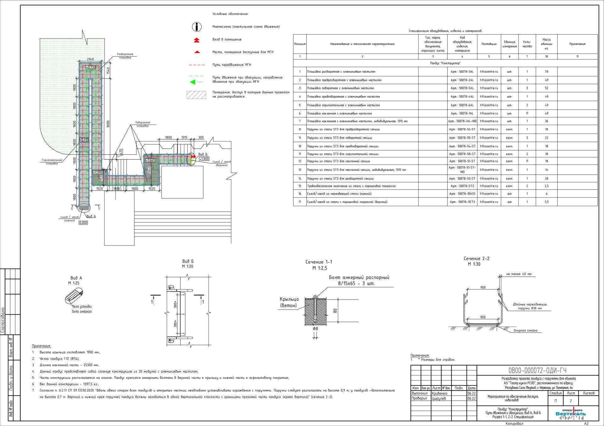 Конструкция включает в себя установку пандуса, который отвечает всем требованиям, указанным в соответствующих нормативных актах, включая размер платформы, ширину марша пандуса, наклон пандуса и установку поручней. Поручни сконструированы таким образом, чтобы выдерживать нагрузку без деформации и быть травмоустойчивыми.
