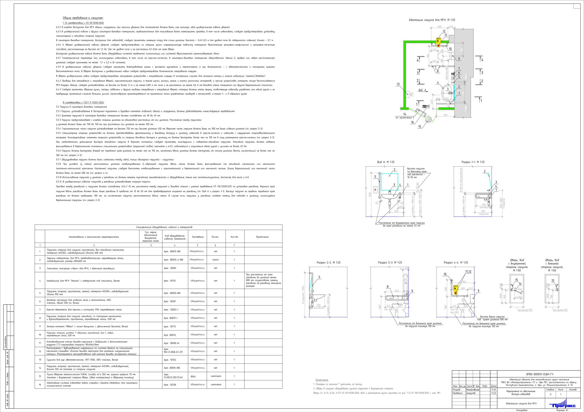 По обеим сторонам от унитаза в мужском санузле установить опорные поручни, откидной и стационарный. Рядом с унитазами предусмотрены кнопку вызова персонала с вибрацией и дополнительным шнурком, сигнал с кнопок передается в место постоянного пребывания персонала. Также предусмотрен умывальник, крючок для трости для трости и костылей, зеркала, поручней для умывальников, дозатора, сенсорного смесителя, сушилки автоматической для рук.