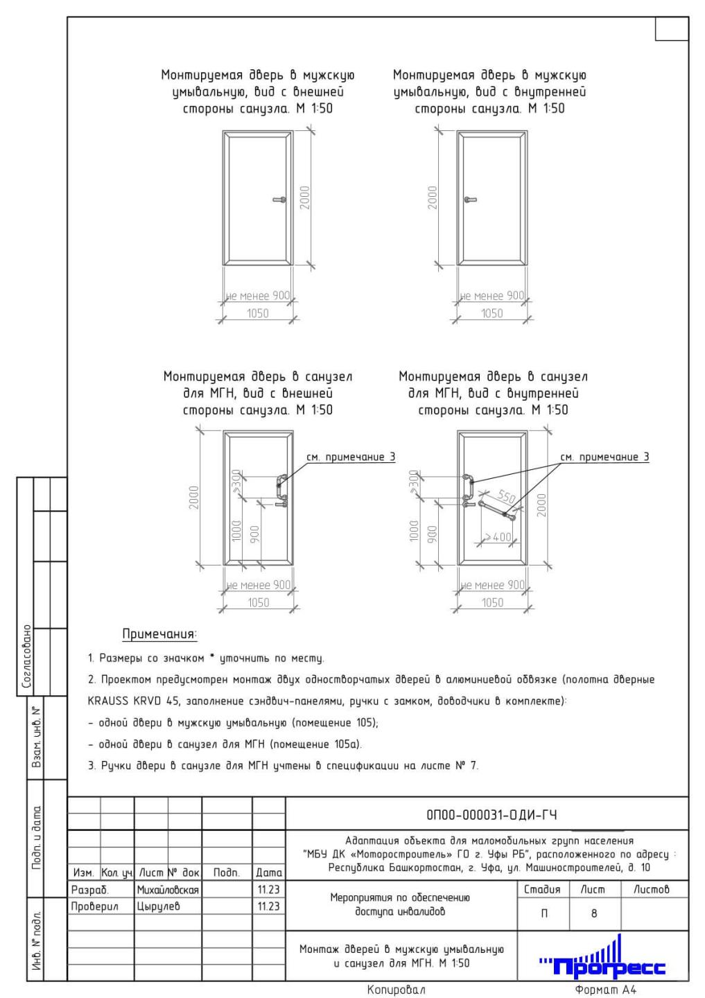 Проектом предусмотрен демонтаж перегородки между фойе и умывальной в мужском санузле с дальнейшим выделением пространства под универсальную кабину для МГН с отдельным входом из фойе.
