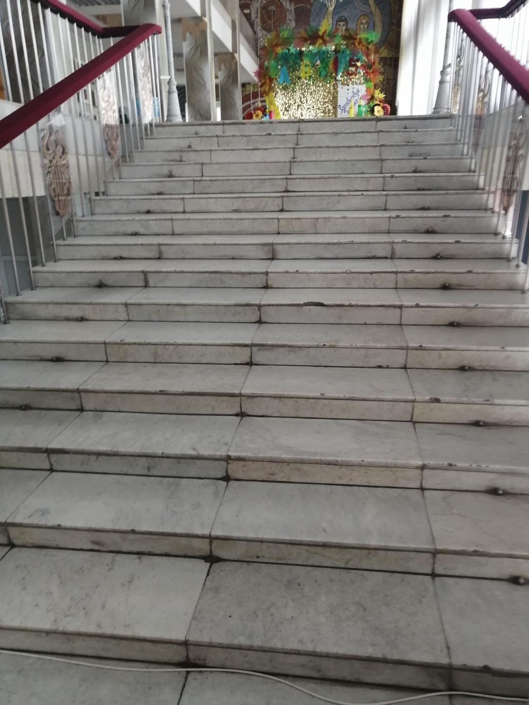 Рифы типа усеченных конусов, усеченных куполов, цилиндров, расположенных в линейном порядке. Расположить на расстоянии 300 мм от кромки проступи нижней и верхней ступеней лестничных маршей. Выполняется тактильной контрастной плиткой со сменными рифами.